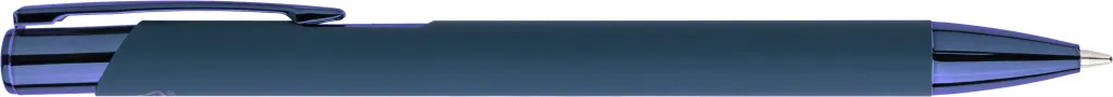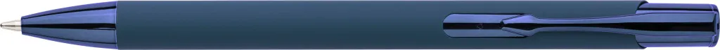 Recycled aluminium rubberized ballpen with shiny UV plastic push button, UV chromed plastic tip, and UV-coated metal clip, all in matching colors. After engraving, a shiny mirror effect in the pen's color appears. Includes an engraved recycled logo. Approximate writing length of 800 metres. Blue ink.