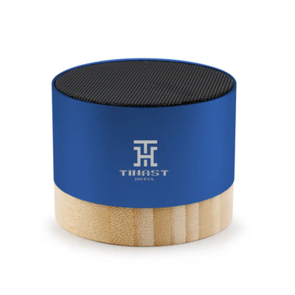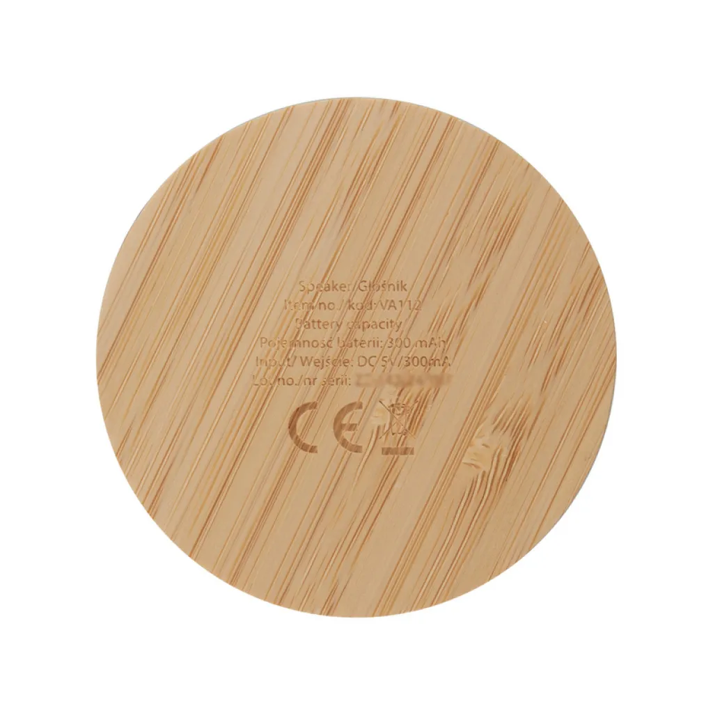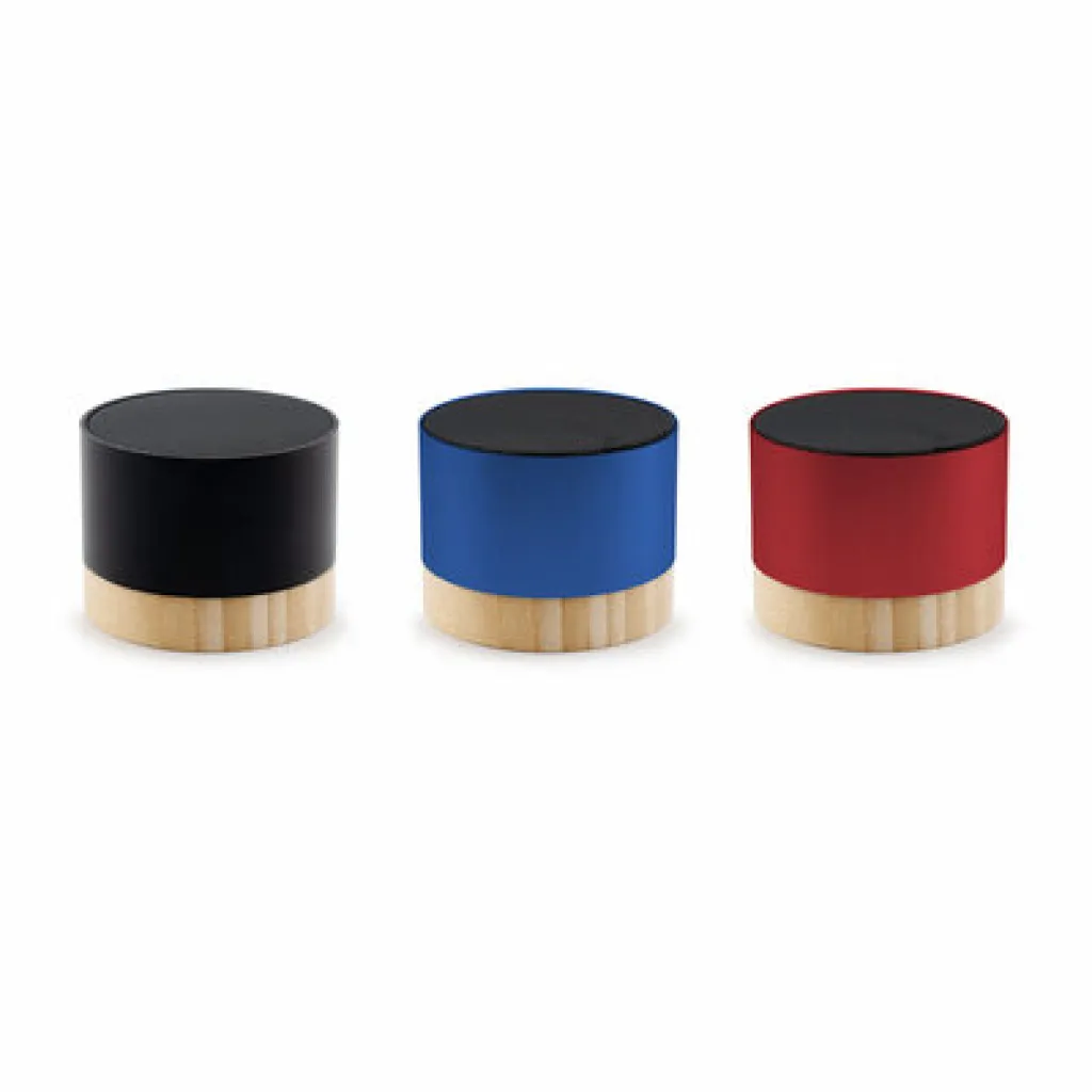 Wireless speaker 3W, BT 5.4, features recycled aluminium body with bamboo base, built-in 300 mAh battery lasts for approx. 2-3h of speaker operation, working distance up to 10 m, USB-C input, included USB-C cable, product made from recycled aluminium and bamboo.