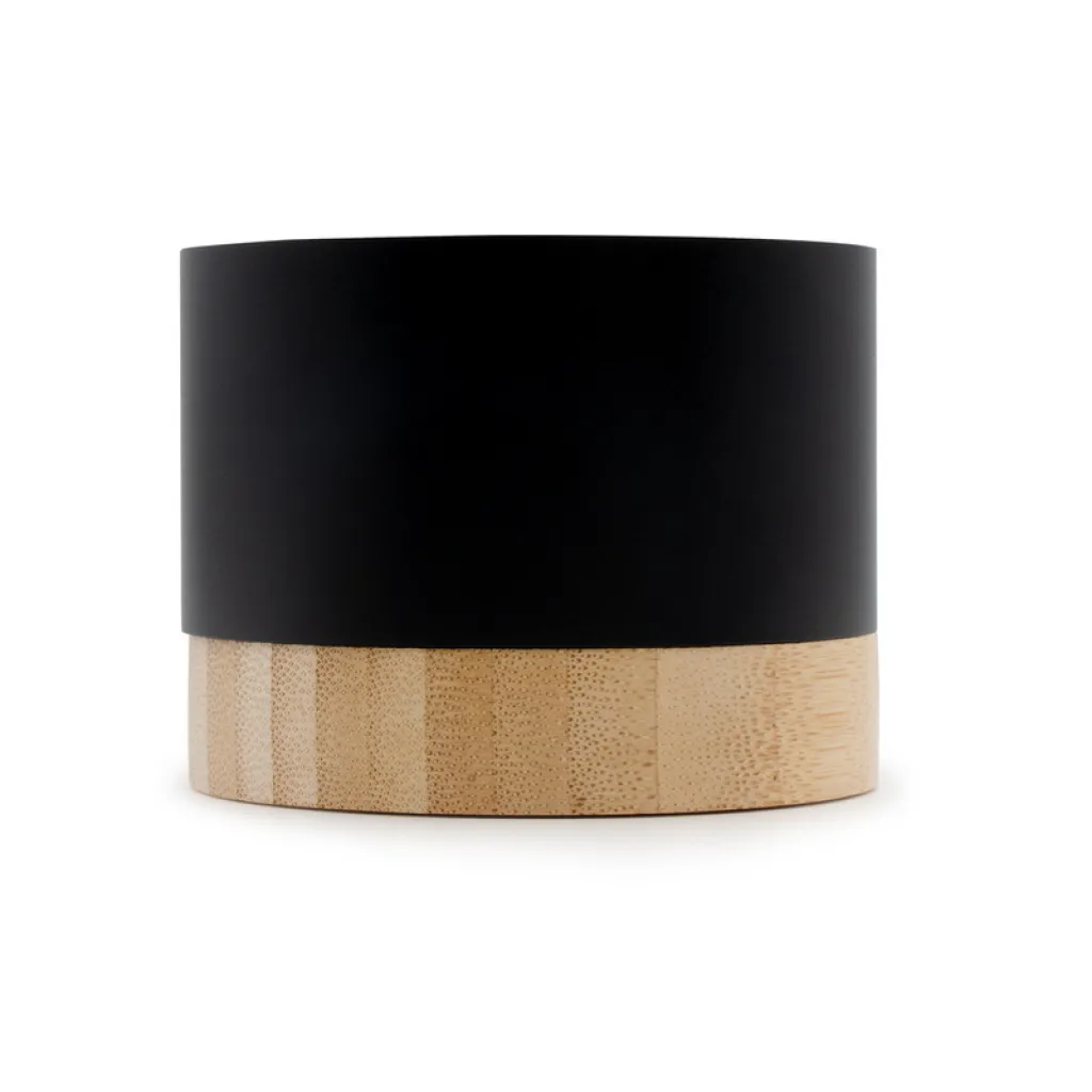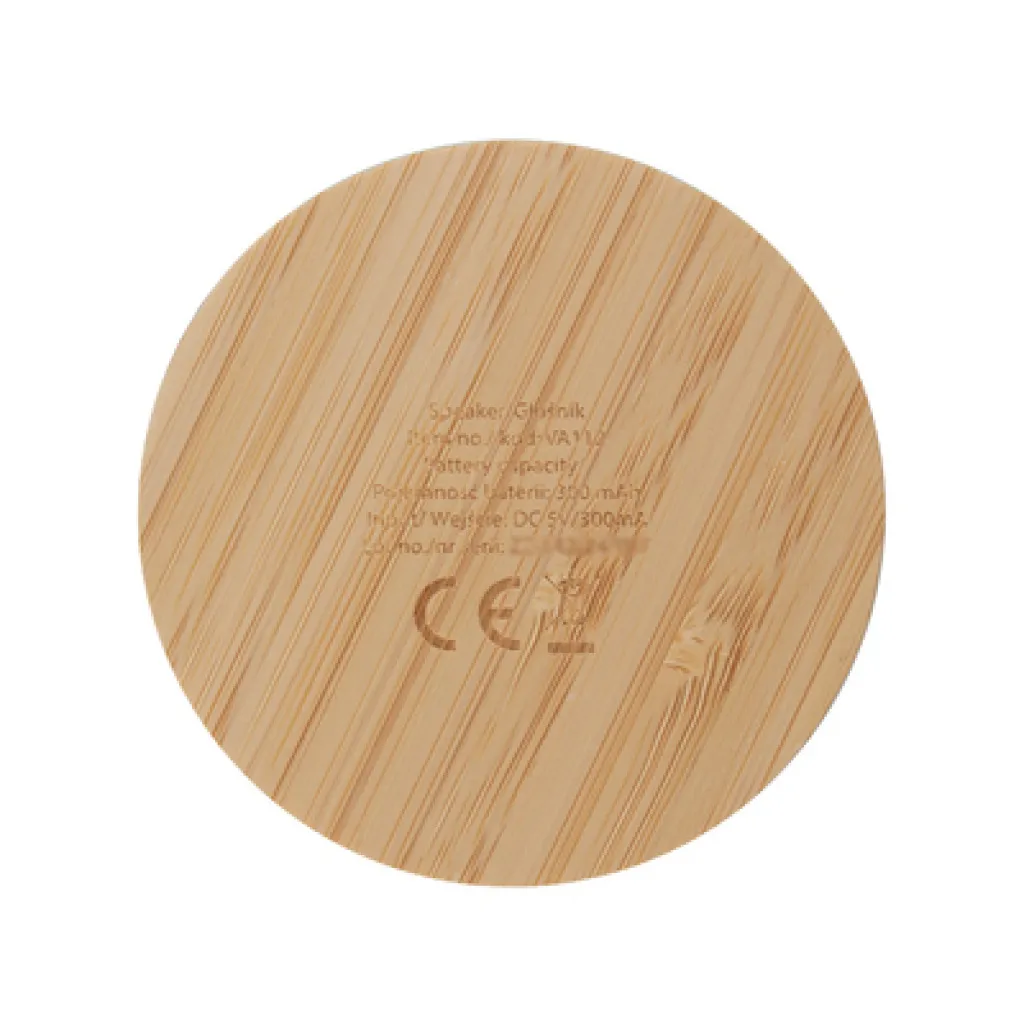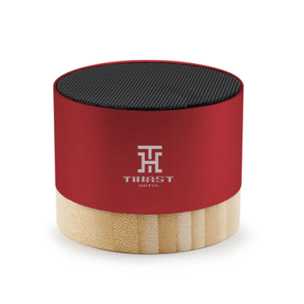 Wireless speaker 3W, BT 5.4, features recycled aluminium body with bamboo base, built-in 300 mAh battery lasts for approx. 2-3h of speaker operation, working distance up to 10 m, USB-C input, included USB-C cable, product made from recycled aluminium and bamboo.