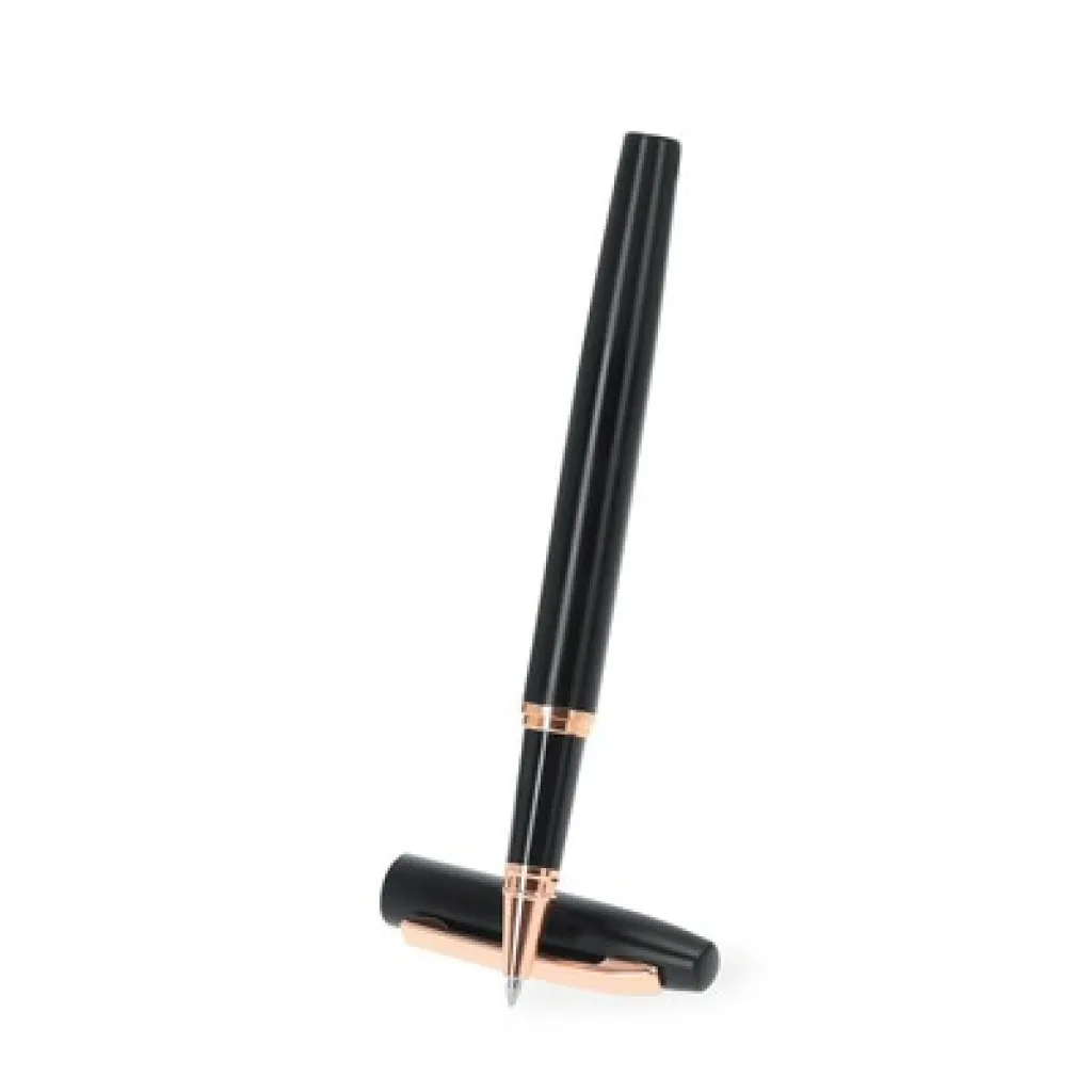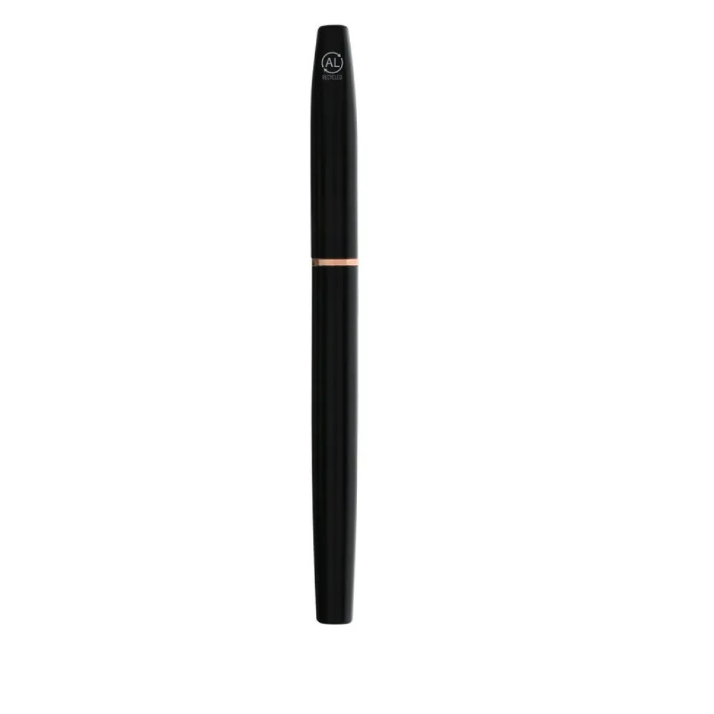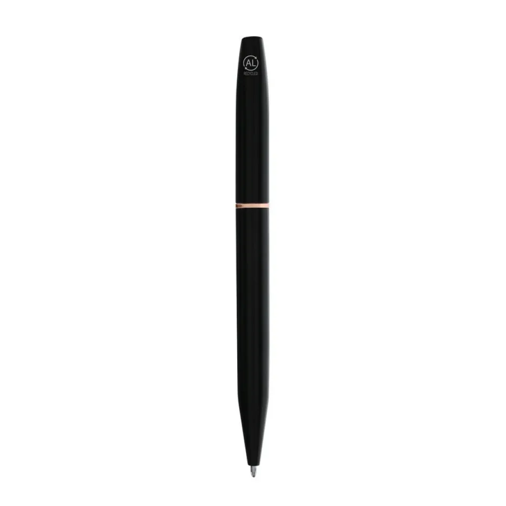 Writing set, ball pen and roller ball pen with black matte finish and elements in rose gold colour, ball pen with revolving mechanism, roller ball pen with cap, with metal clip, both pens write in blue, black gift box included, includes recycled aluminium icon on product, set made from recycled aluminium, compliant with GRS (Global Recycled Standard) certificate.