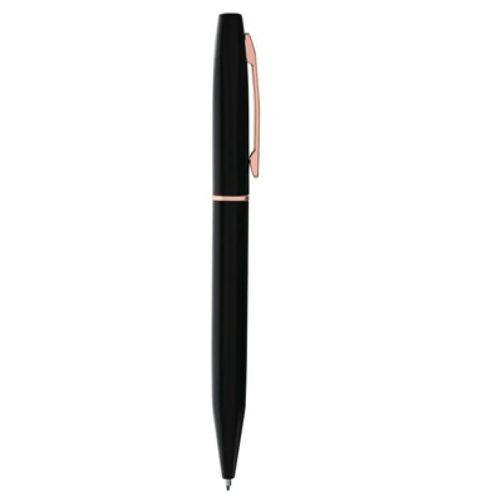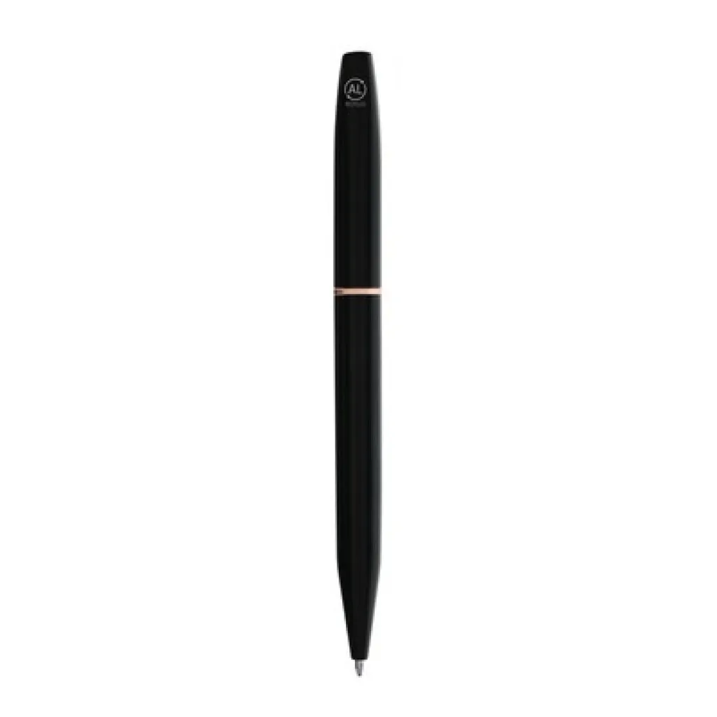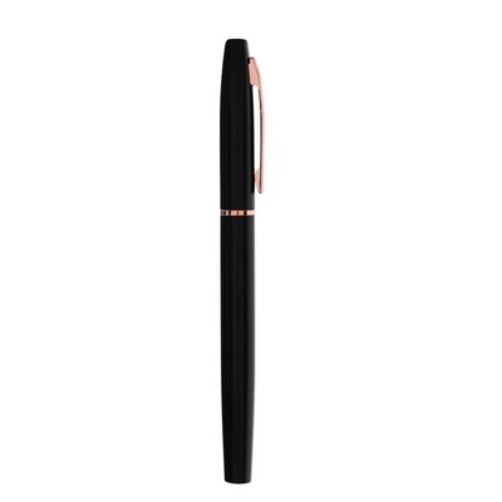 Writing set, ball pen and roller ball pen with black matte finish and elements in rose gold colour, ball pen with revolving mechanism, roller ball pen with cap, with metal clip, both pens write in blue, black gift box included, includes recycled aluminium icon on product, set made from recycled aluminium, compliant with GRS (Global Recycled Standard) certificate.