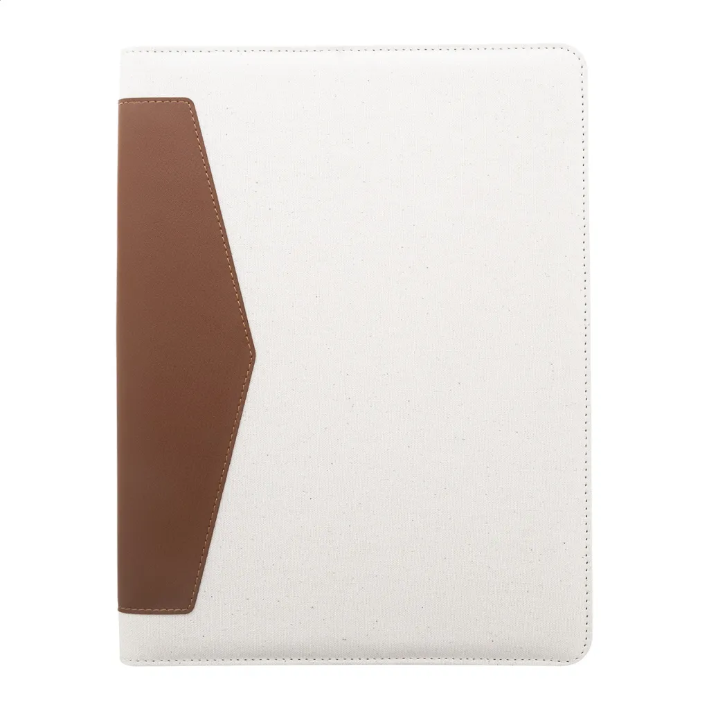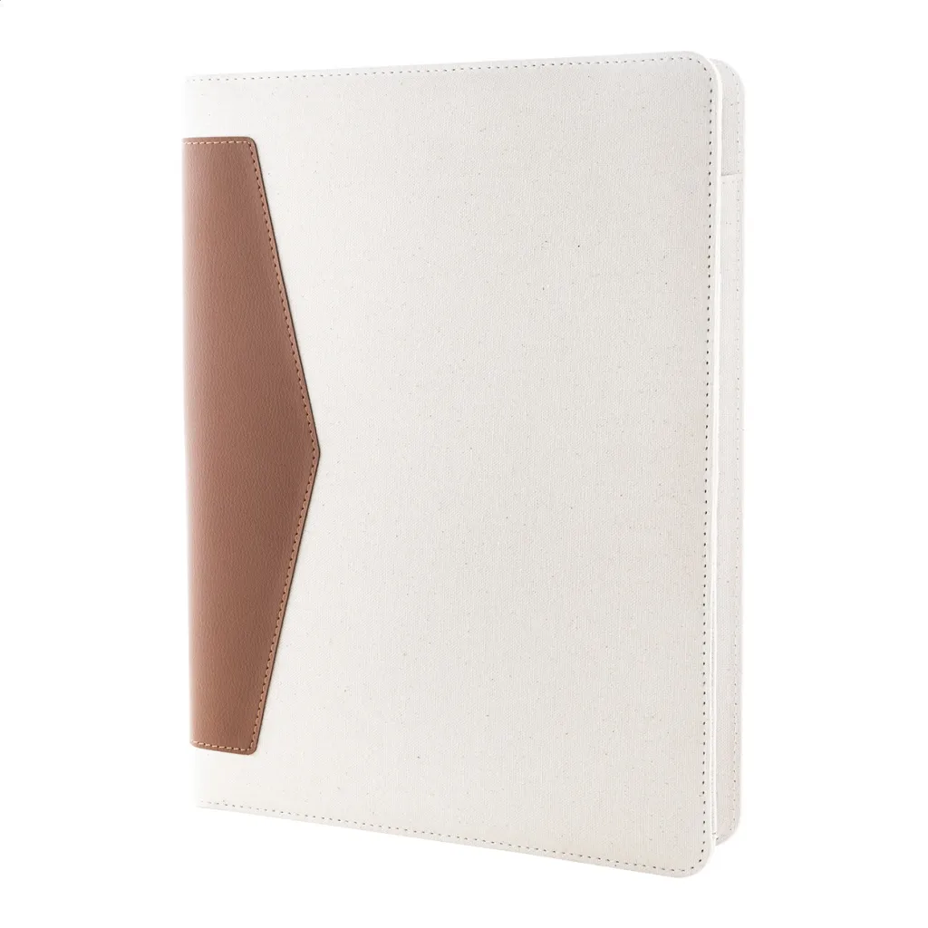 A4 sized, recycled canvas and recycled PU leather document folder with multiple inside organizer pockets. With 20 lined sheets notepad in recycled paper. 70% recycled cotton and 30% RPET polyester.