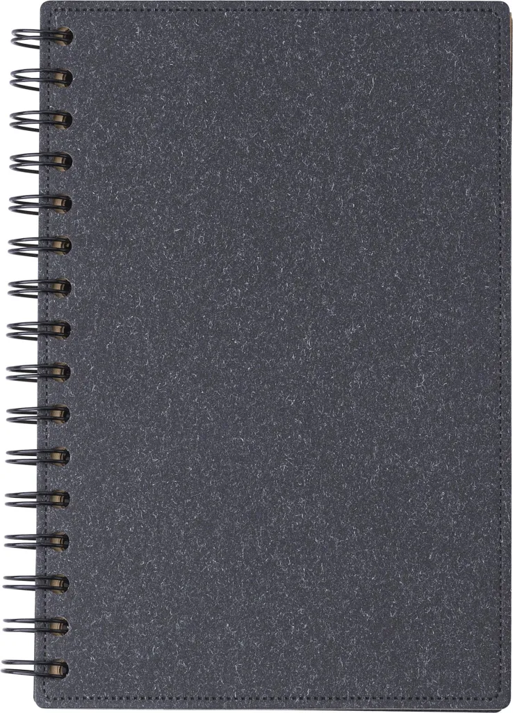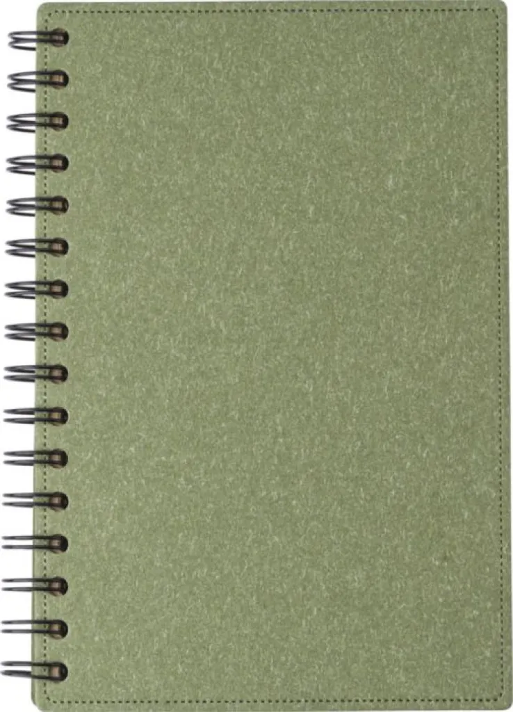 Recycled carton hardcover wire-o notebook (approx. A5) with 160 lined recycled brown paper pages (65gms). Recycle logo on the pages.