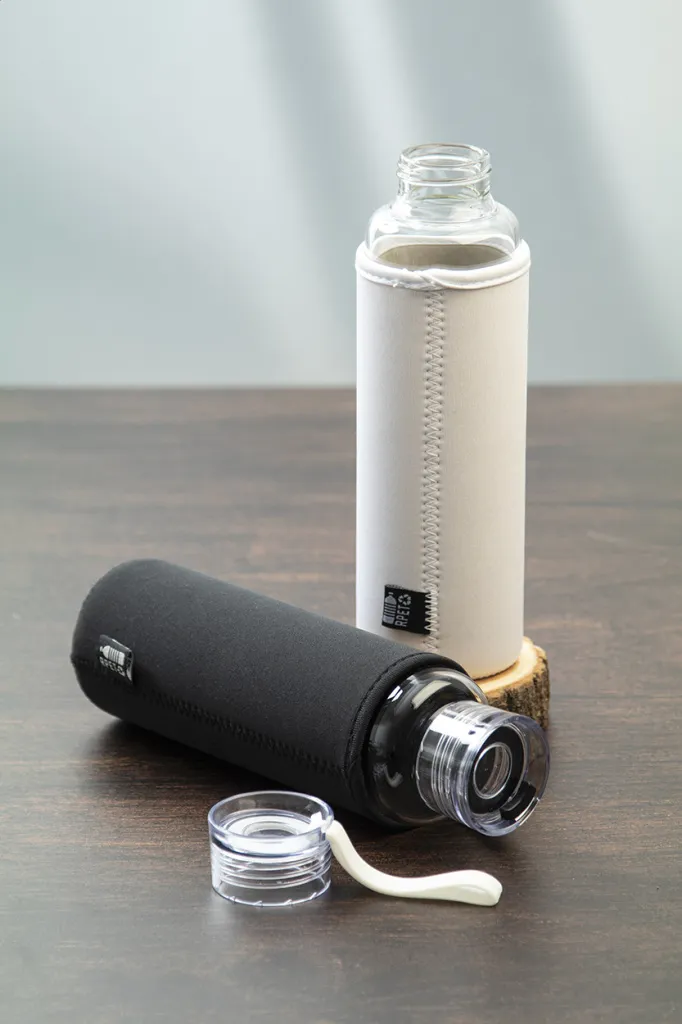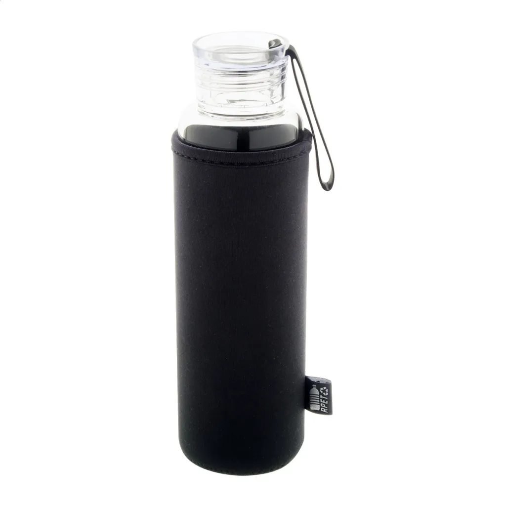 Recycled glass bottle with PS plastic lid, silicone carry strap and RPET neoprene cover, 550 ml. Not suitable for carbonated drinks.