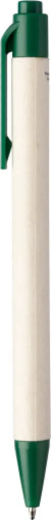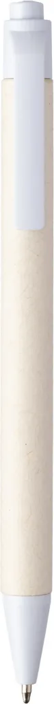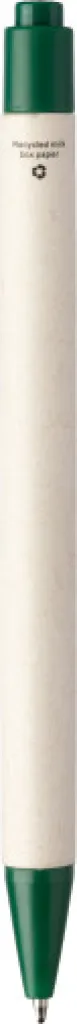 Recycled milk carton ballpen with recycled ABS colored parts. Includes recycled ABS logo and recycled milk carton logo. Blue ink.