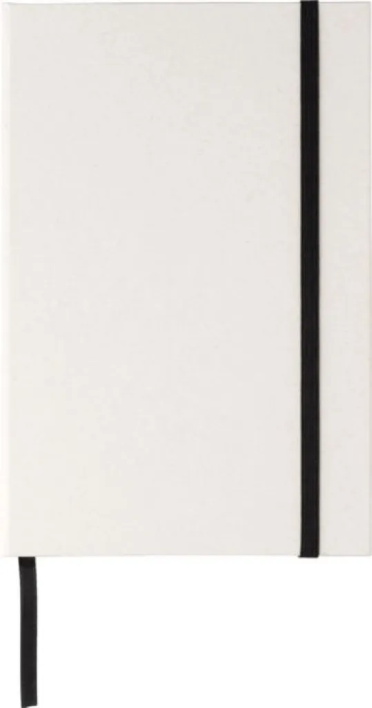 Recycled milk carton notebook A5 with 80 sheets, elastic band, and ribbon. Made of 70% recycled milk carton and 30% recycled paper. Including the milk carton hot stamp on the bottom of the cover.
