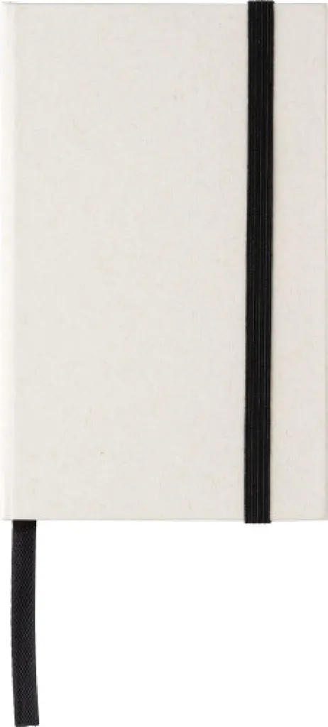 Recycled milk carton notebook A6 with 80 sheets, elastic band, and ribbon. Made of 70% recycled milk carton and 30% recycled paper. Including the milk carton hot stamp on the bottom of the cover.