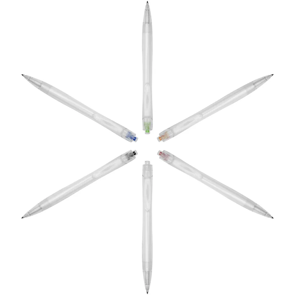 Click action ballpoint pen made from recycled PET, reducing the use of virgin plastic. The ballpoint pen comes with a transparent barrel and coloured push button. It is preloaded with a blue refill and can be combined with the 107763 Honhua RPET notebook.