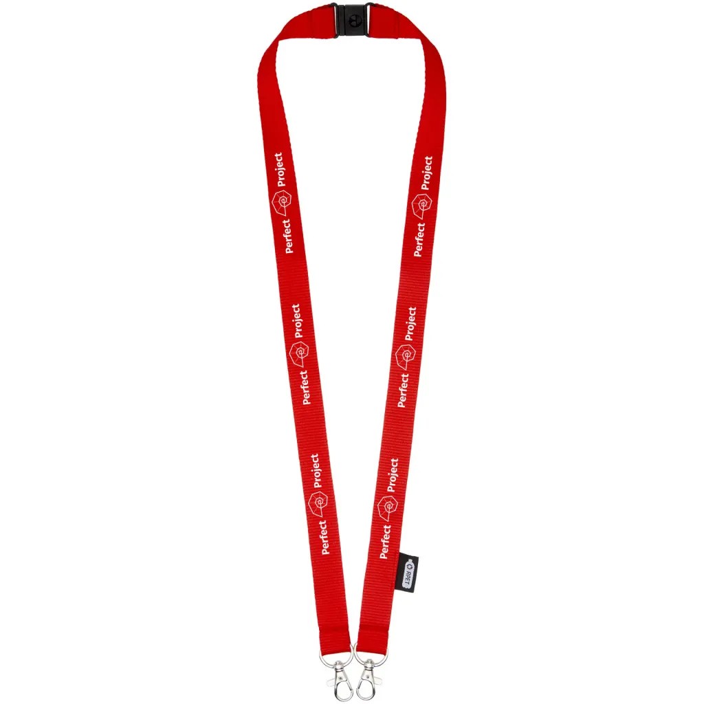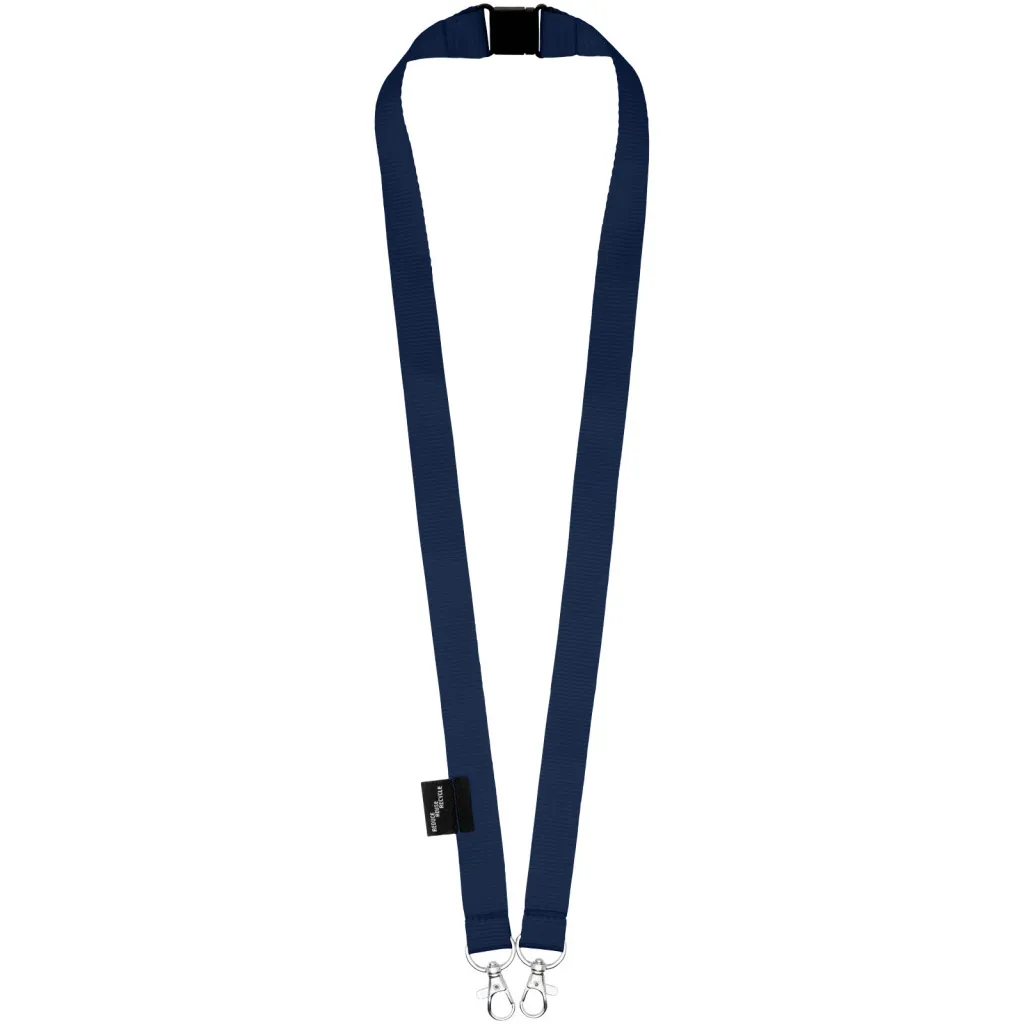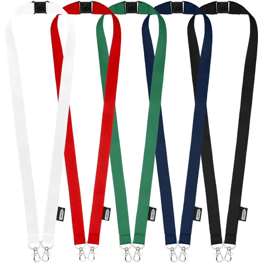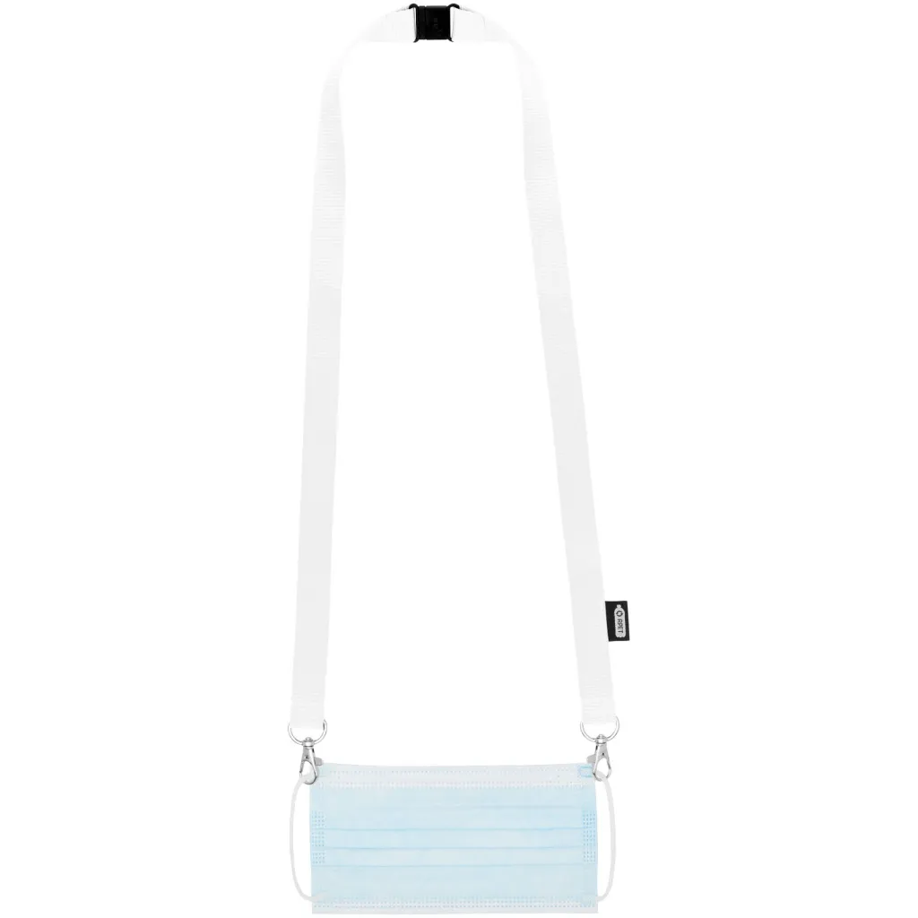 Recycled PET lanyard with breakaway closure to hold a face mask and badge holder. Comes with two high quality oval hooks with lobster clips. Particularly suitable for wide card holders. Offers great value for money and impressive logo sizes when looking for a green choice.