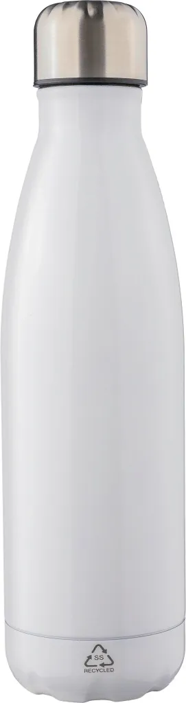 Recycled stainless steel double-walled flask (500 ml) with screw cap. The interior is made of stainless steel 304, and the exterior is stainless steel 201. Recycled logo engraved on the flask. Individually packaged in a brown cardboard box.