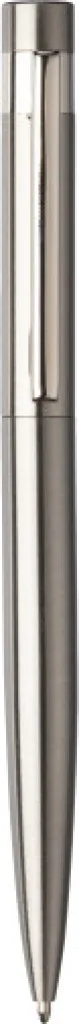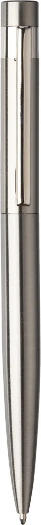 Recycled stainless steel twist ballpen, including a recycled stainless steel logo on the backside, with blue ink. Individually packaged in a kraft paper gift box.