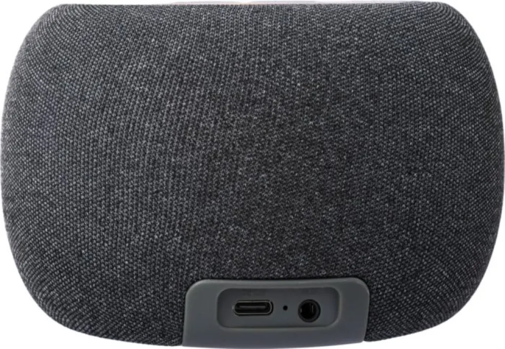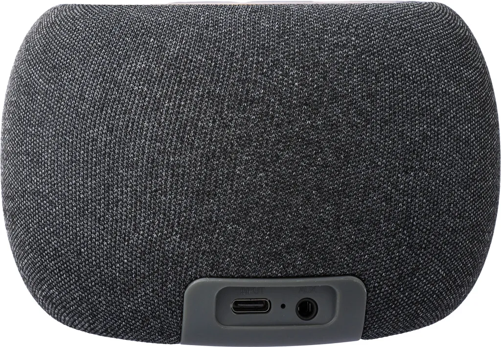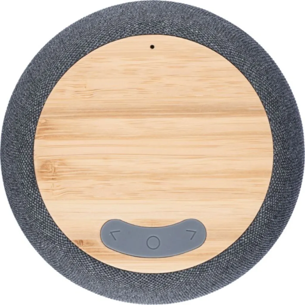 Bamboo and recycled ABS speaker with fabric details around the speaker. 5W output, DC 5V input, 1200mAh built-in rechargeable battery, with 6 hours of playing time. Working distance of 15-20 meters, signal-to-noise ratio of 87 dB. Frequency range: 100 Hz to 20 kHz. Includes 50 cm Type-C charging cable. Wireless connection technology: 5.2. Individually packaged in a brown cardboard box.