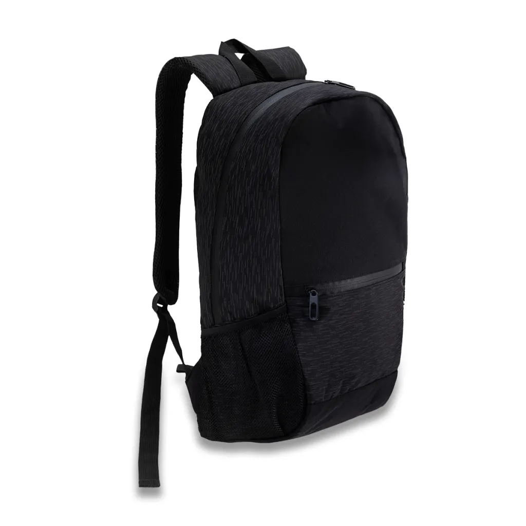 Urban backpack with elements made of fabric with slightly reflective thread. It has a large main compartment, an internal pocket and two smaller pockets for accessories. Outside, there is a front zippered pocket and two side pockets made of mesh. Rubberized zippers. Soft and comfortable suspenders covered with mesh. Capacity 10 liters.