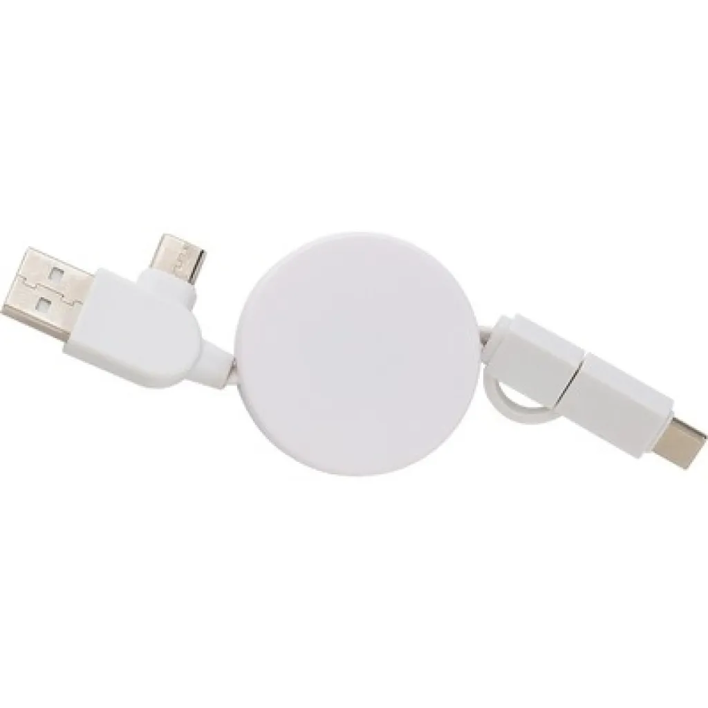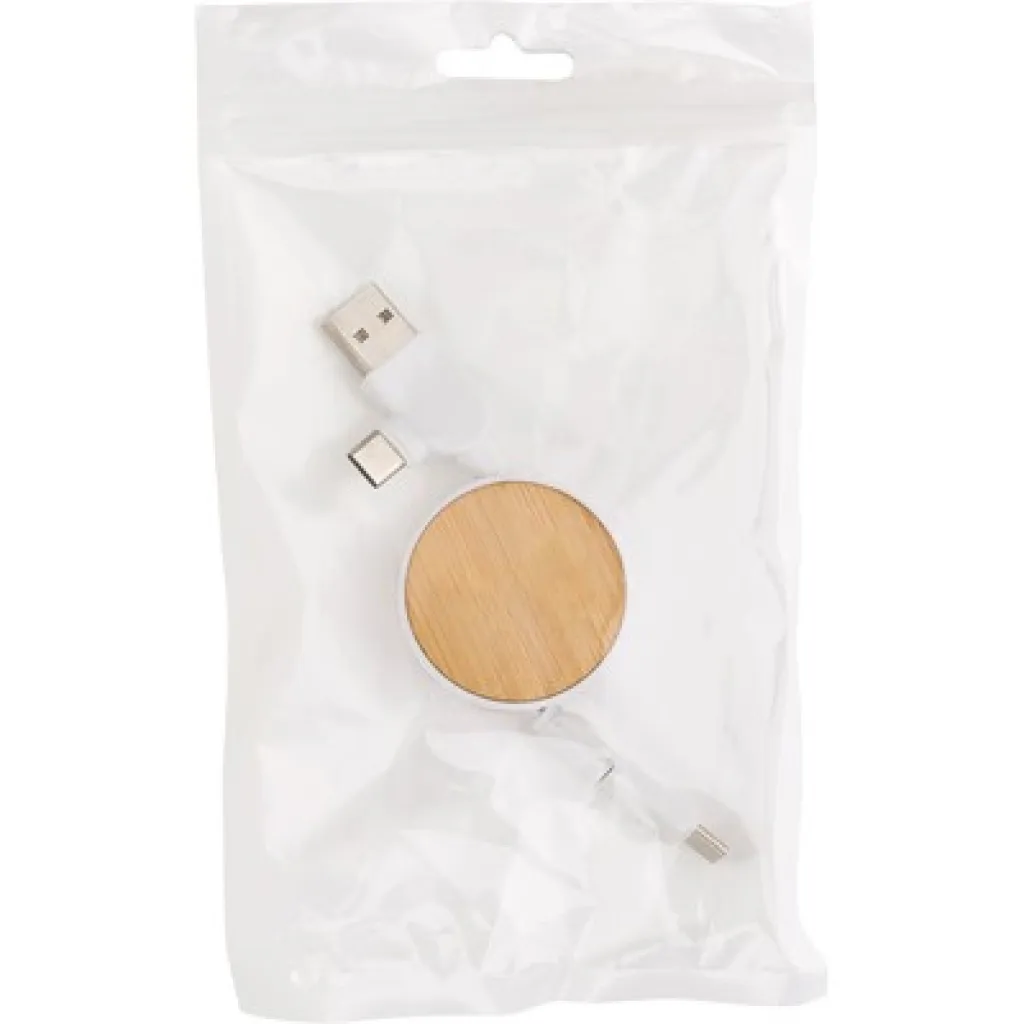 Retractable charging cable with 4 ends: USB, 2x USB Type-C and compatible with iOS devices, bamboo elements.