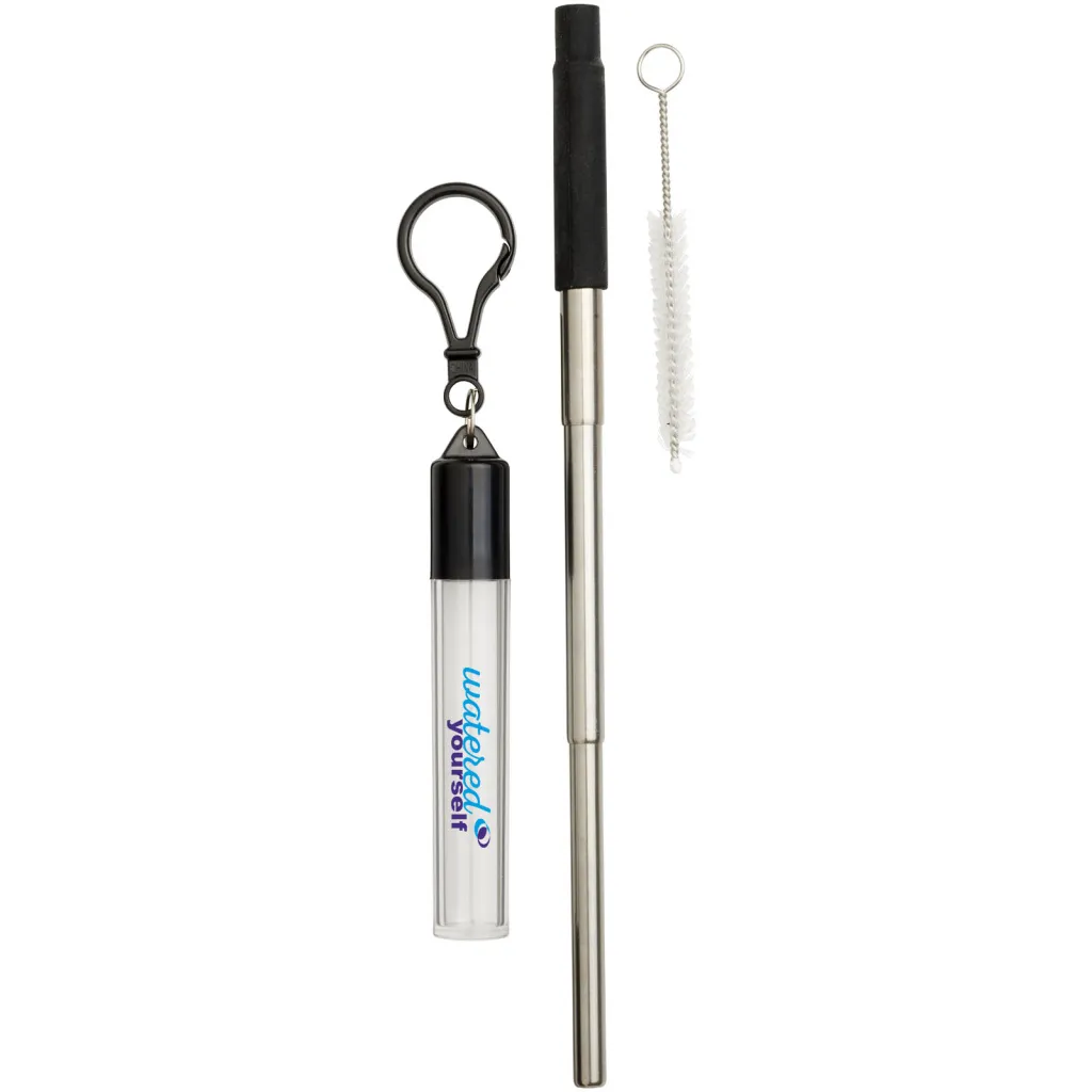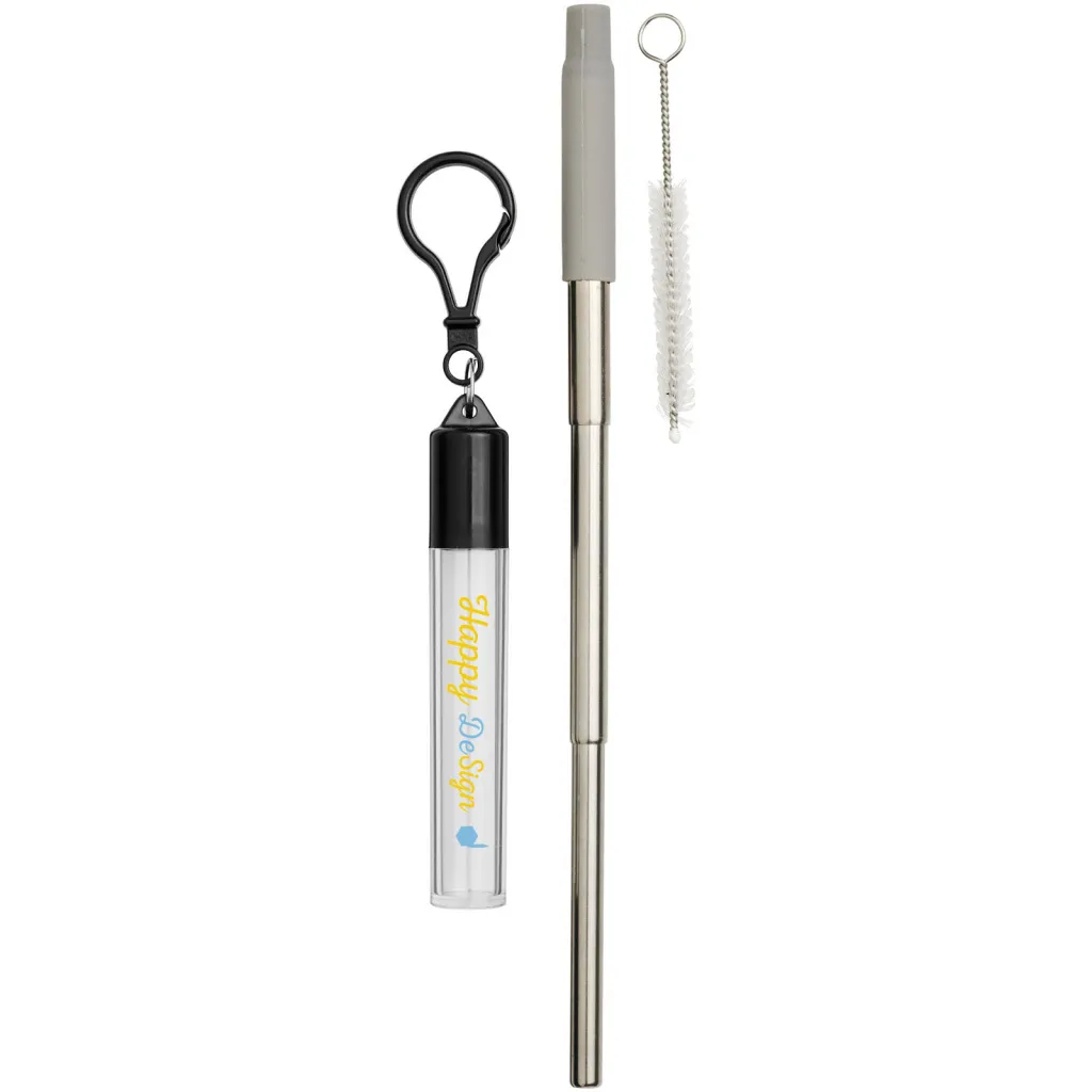 Reusable stainless steel straw with silicone tip, a straw brush, and carrying case with carabiner. Straw is stretchable to fit carrying case and measures 21cm when extended. Suitable for cold drinks.