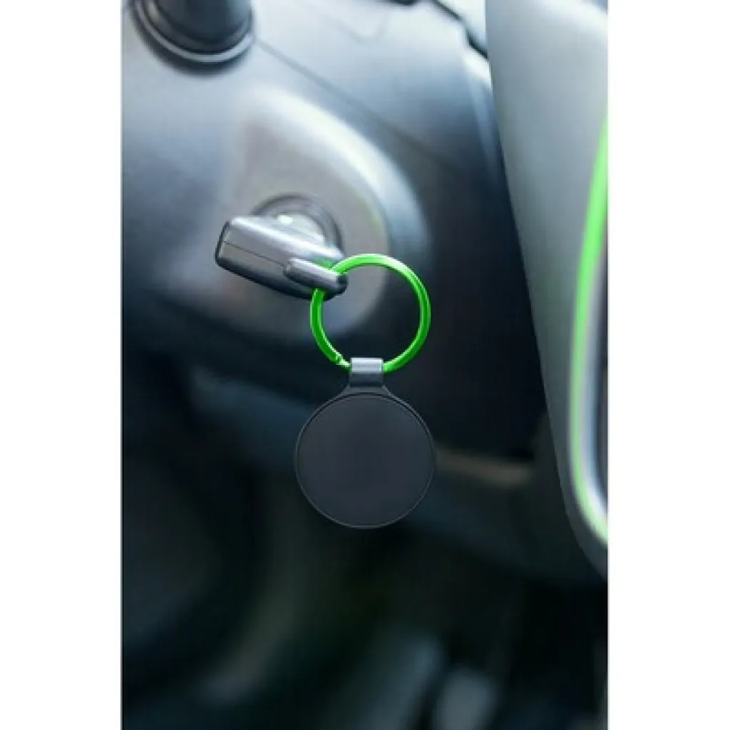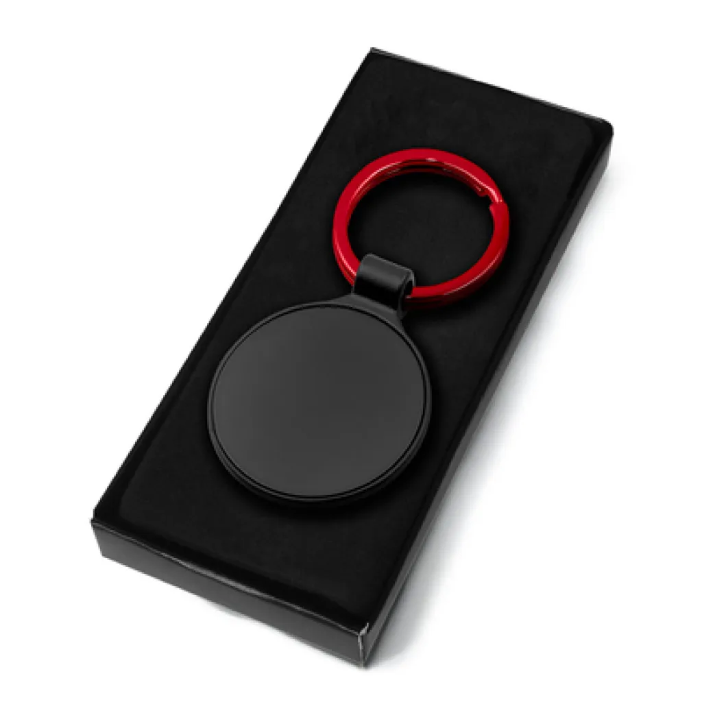 Round keyring with special space for personalization, engraving reveals a coloured surface, black gift box included, product made of metal