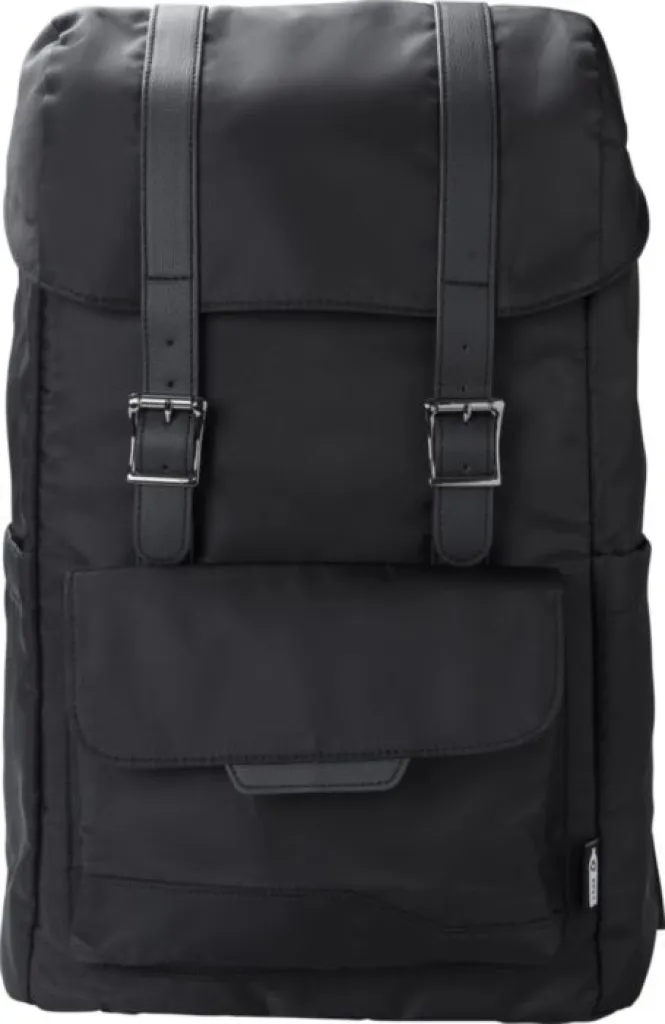 rPET (290T) polyester twill flap backpack. PU straps. Two bottle pockets on sides. Magnet closing pocket on front. Drawstring closing for inside pocket. Laptop (15 inch) and normal pocked. Trolleystrap on backside. Water reppelant coating.