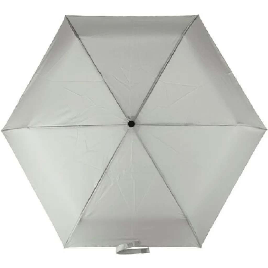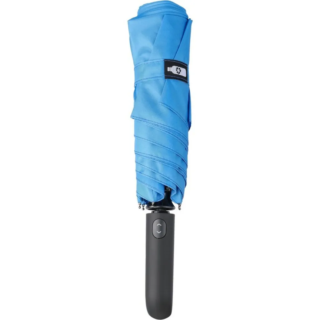 Automatic umbrella with 6 panels and RPET fabric, includes RPET icon on the tag, hook and loop tape and pouch, with a carabiner that allows to attach the umbrella to bag when traveling, also protects against the wind, product made from plastic, RPET, fiberglass