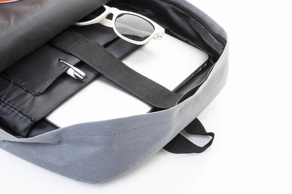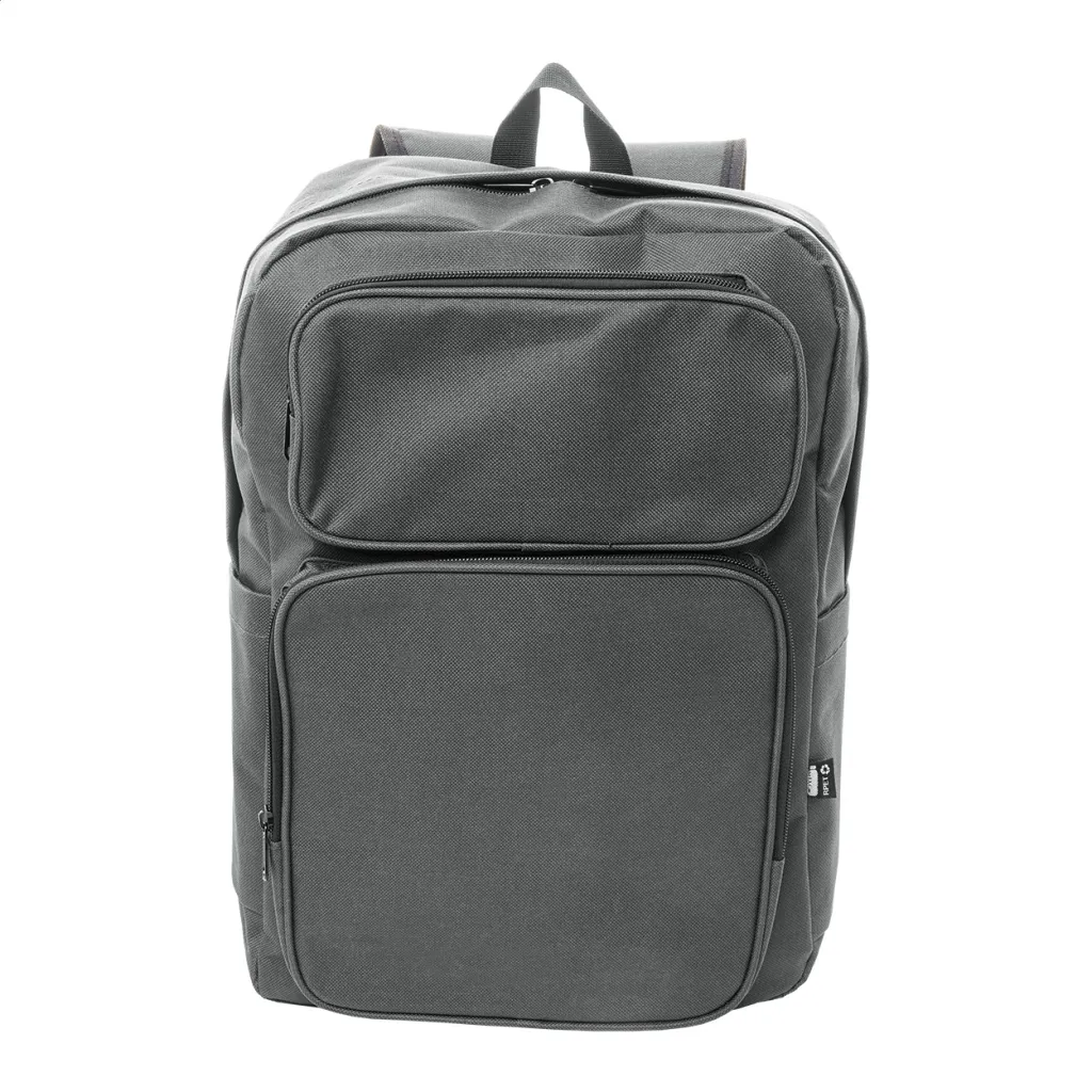 RPET backpack with zipped main compartment, 2 zipped front pockets, side pockets and padded laptop (15") and tablet (10") compartment. With padded back and shoulder straps. 600D RPET polyester, with distinctive RPET label.