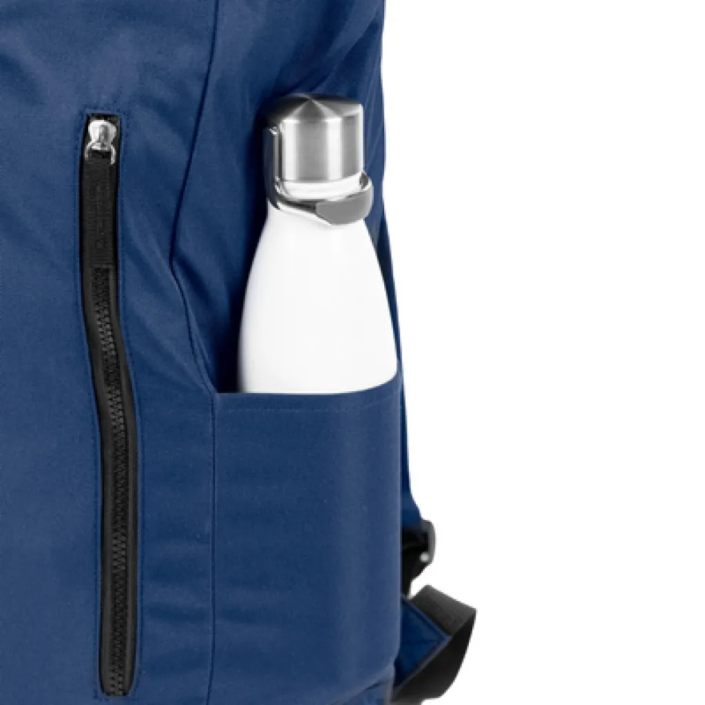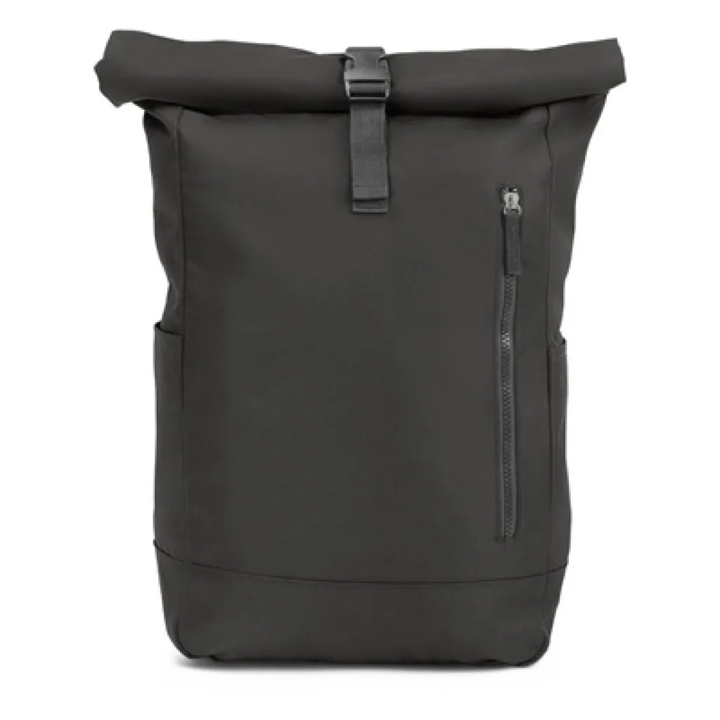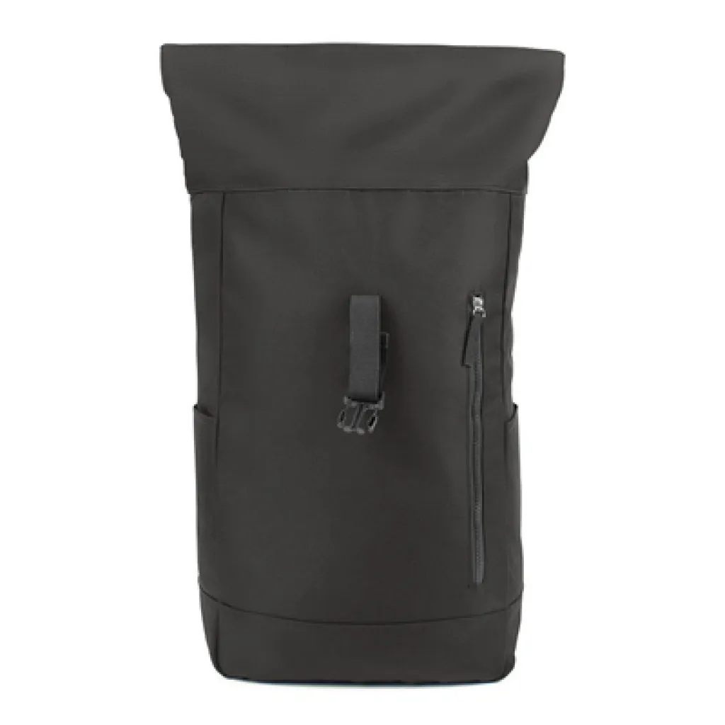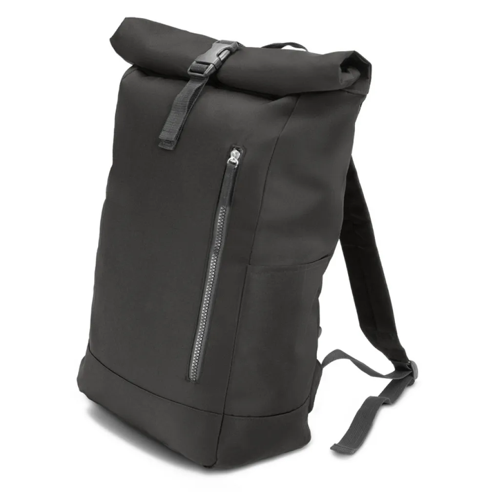 Backpack with zipped main compartment and front pocket, made from RPET, compliant with GRS (Global Recycled Standard) certificate, 2 side pockets, rolled-top construction closed with buckle, adjustable shoulder straps.