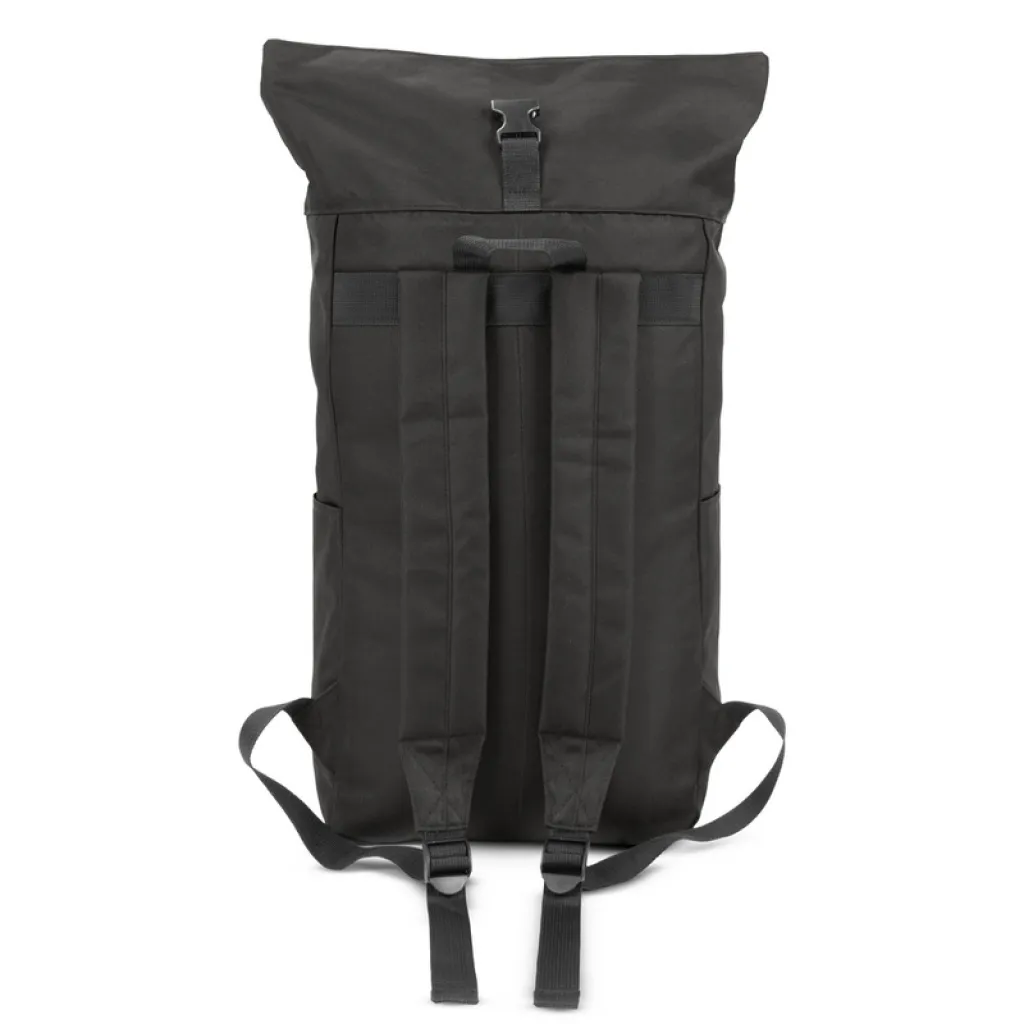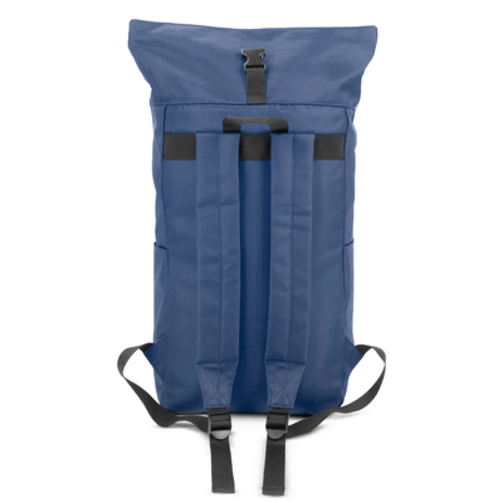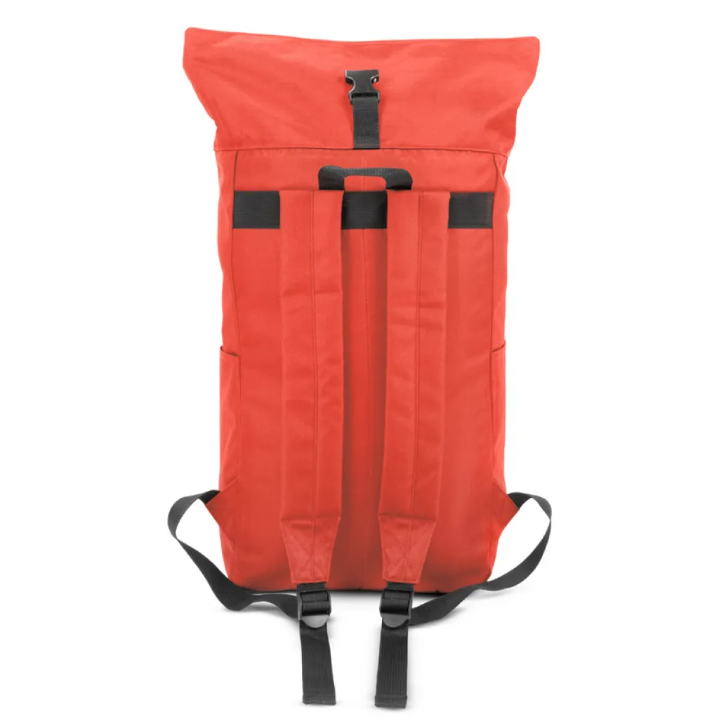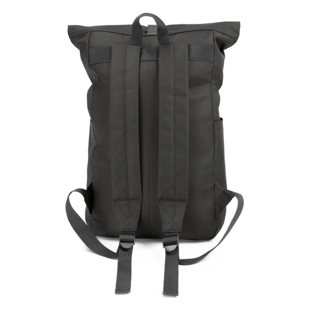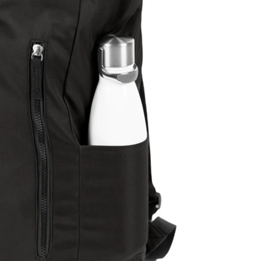 Backpack with zipped main compartment and front pocket, made from RPET, compliant with GRS (Global Recycled Standard) certificate, 2 side pockets, rolled-top construction closed with buckle, adjustable shoulder straps.