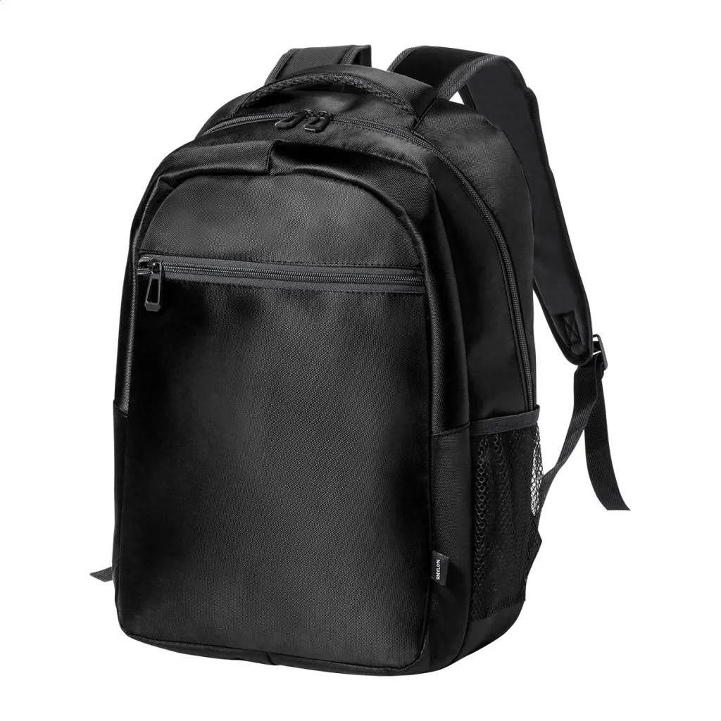 RPET backpack with zipped compartments, mesh side pockets, padded laptop (15") pocket, trolley strap, padded back and shoulder straps. 420D RPET polyester with distinctive RPET label.