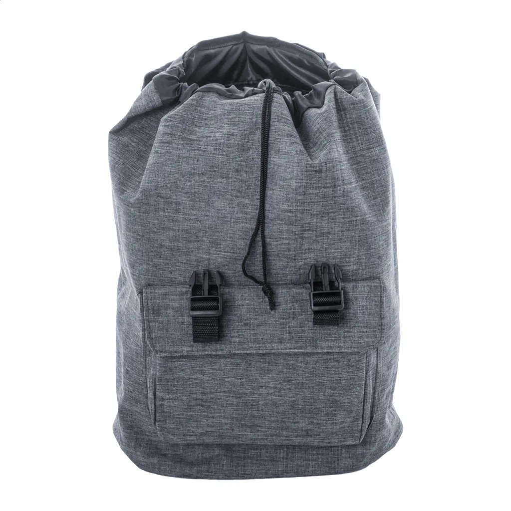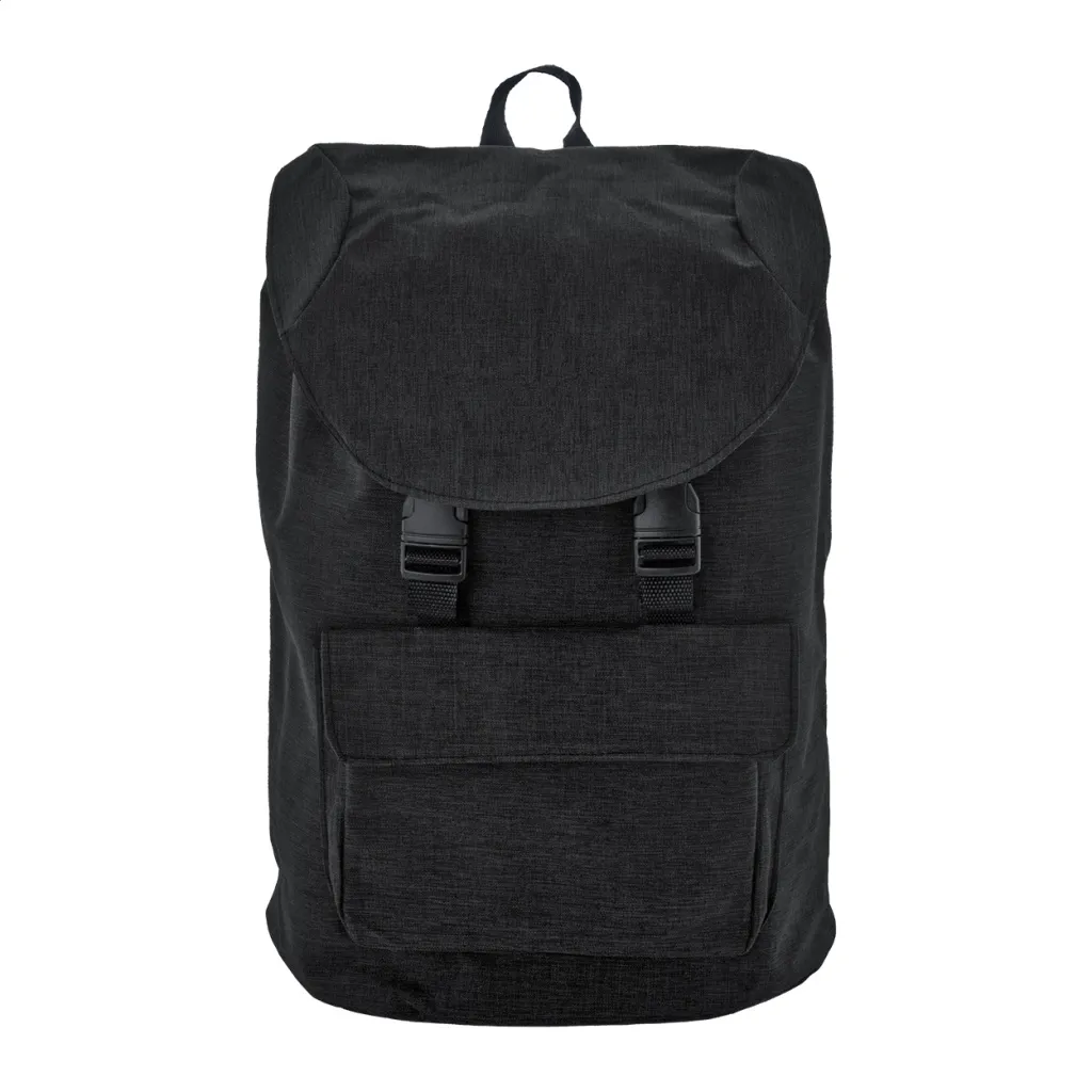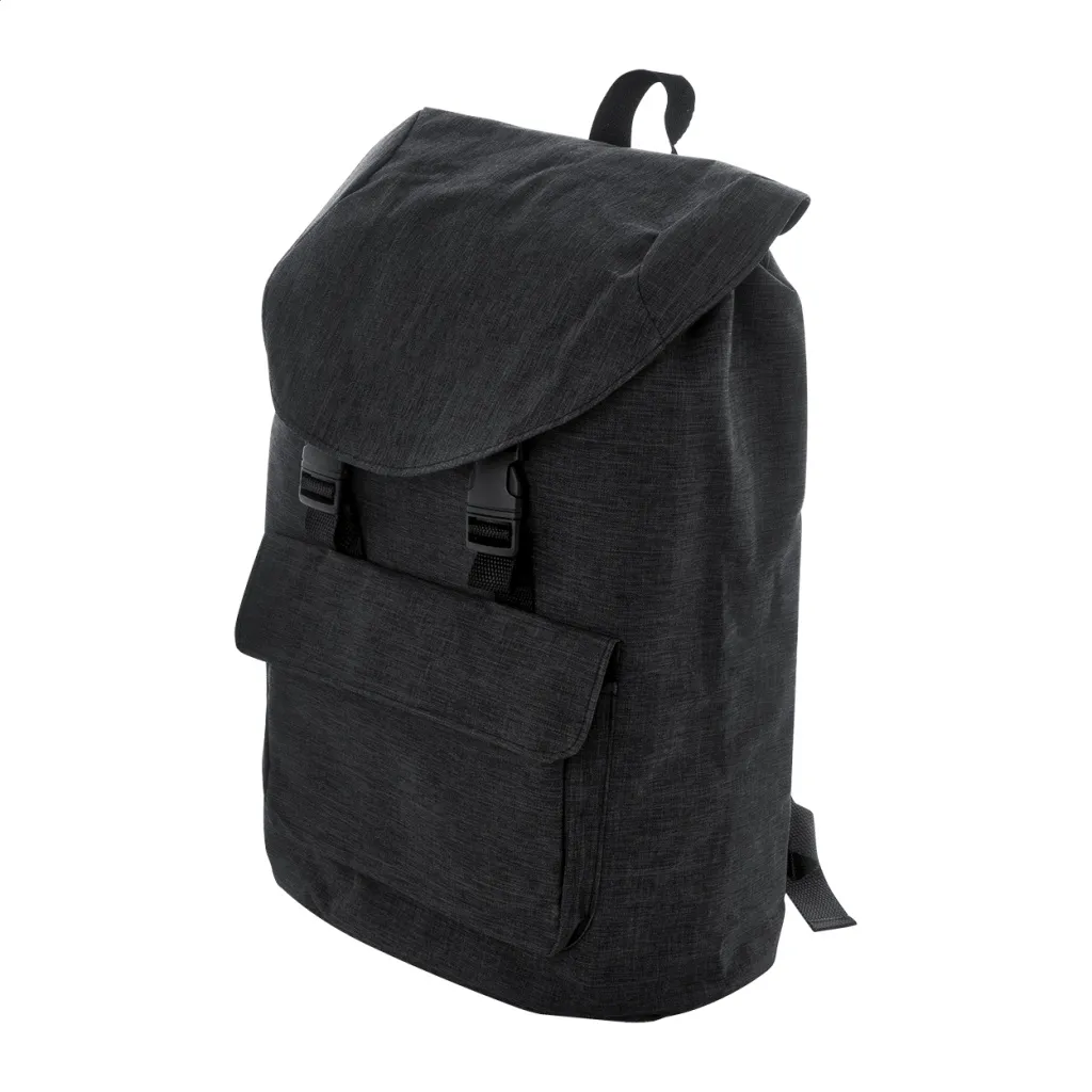 RPET backpack with buckle and drawstring closure, velcro front pocket, laptop (15") compartment, padded back and shoulder straps. 300D RPET polyester with distinctive RPET label.