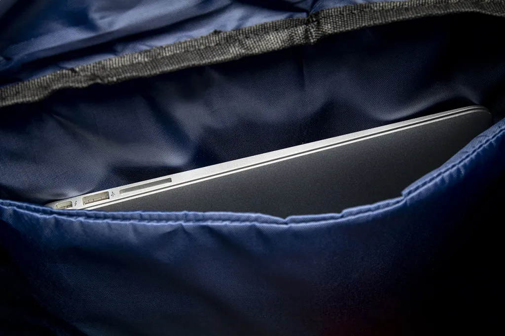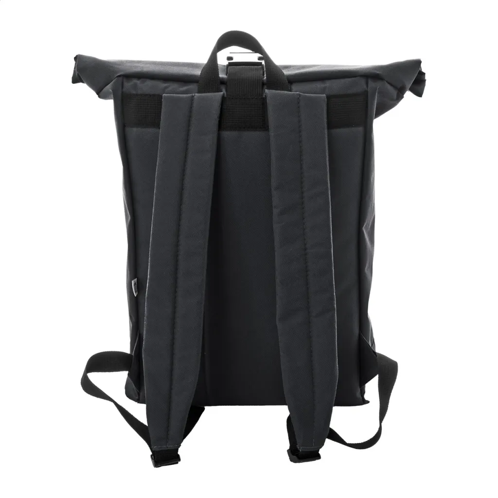 RPET rolltop backpack with buckle closure, zipped front pocket, padded laptop (15") compartment, padded back and shoulder straps. 600D RPET polyester with distinctive RPET label.
