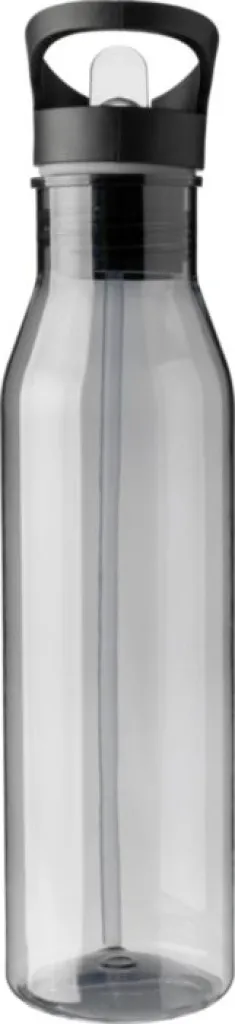 rPET drinking bottle (730 ml) with foldable spout and straw inside. Carrying loop on the topside of the PP lid. Packaged in bulk with tissue paper.
