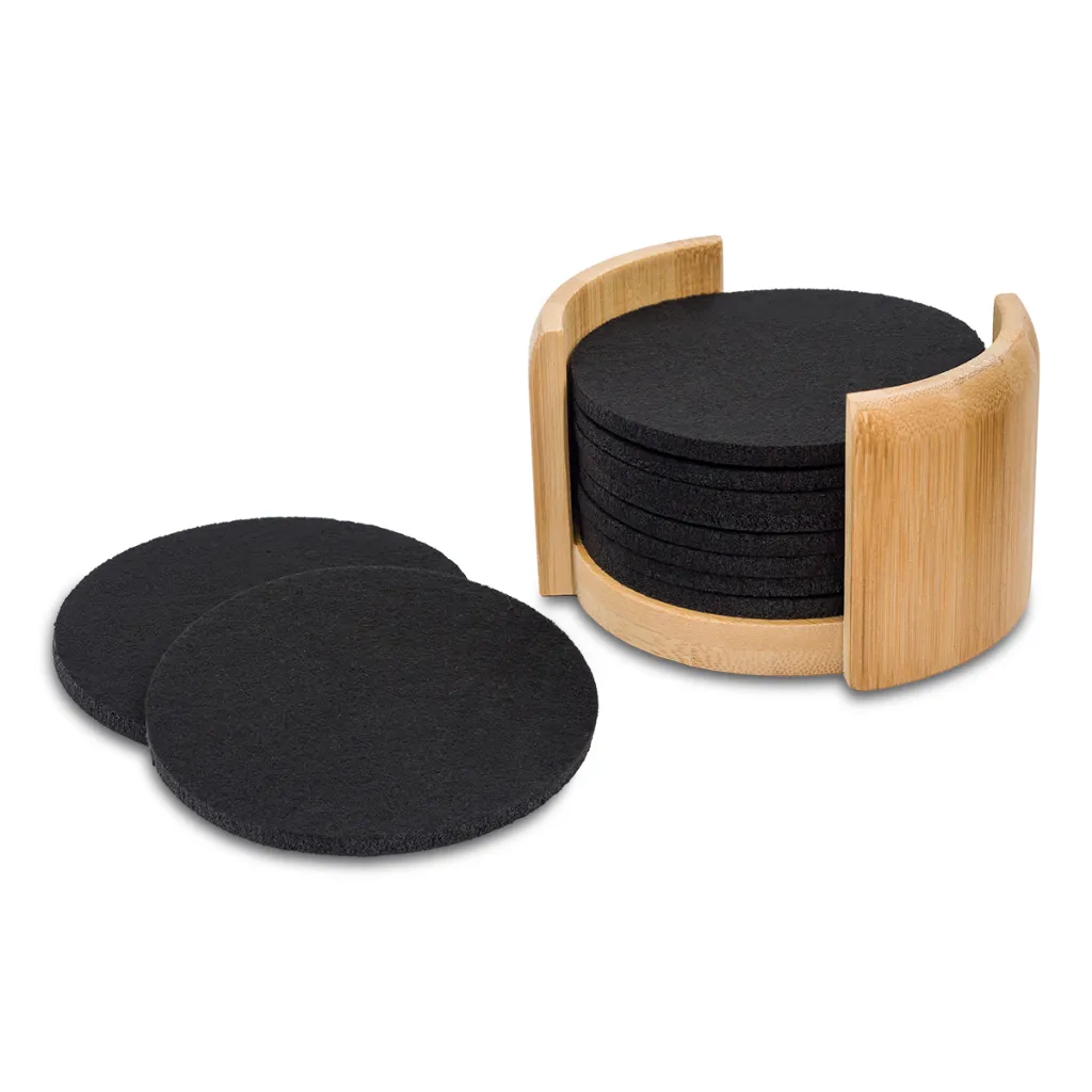 Set of 10 coasters made of RPET felt in a bamboo holder.