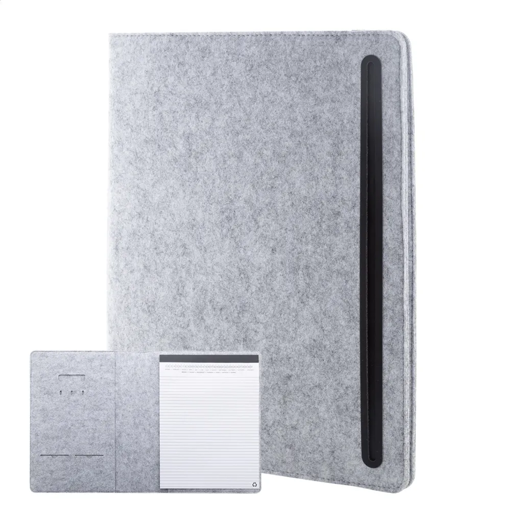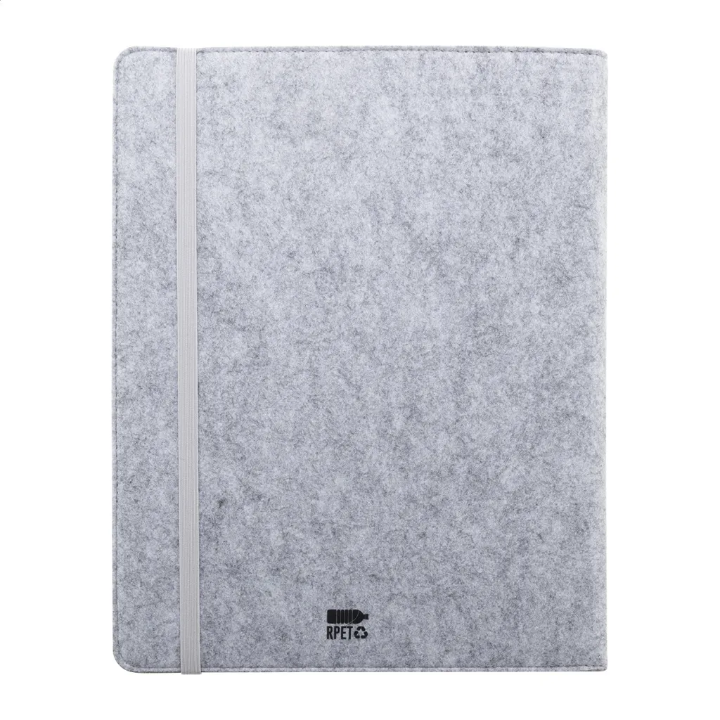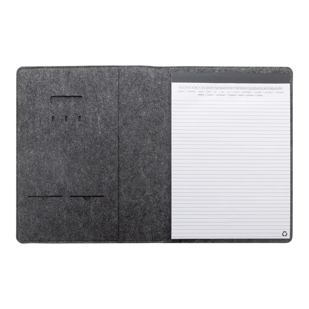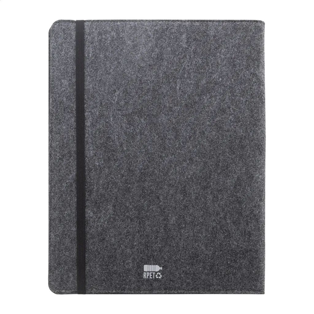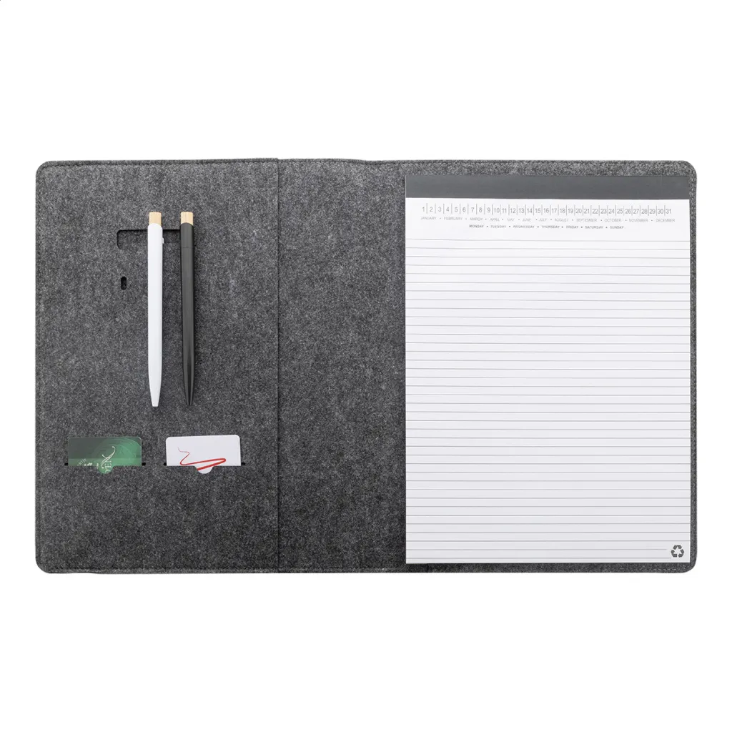 A4 sized, RPET felt document folder with front and multiple inside organizer pockets. With 20 lined sheets notepad in recycled paper.