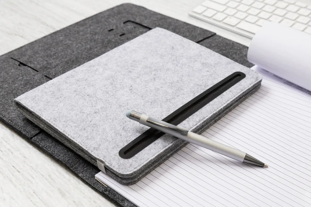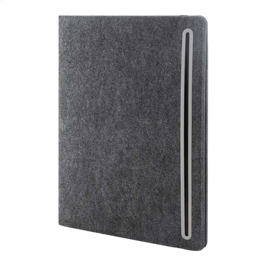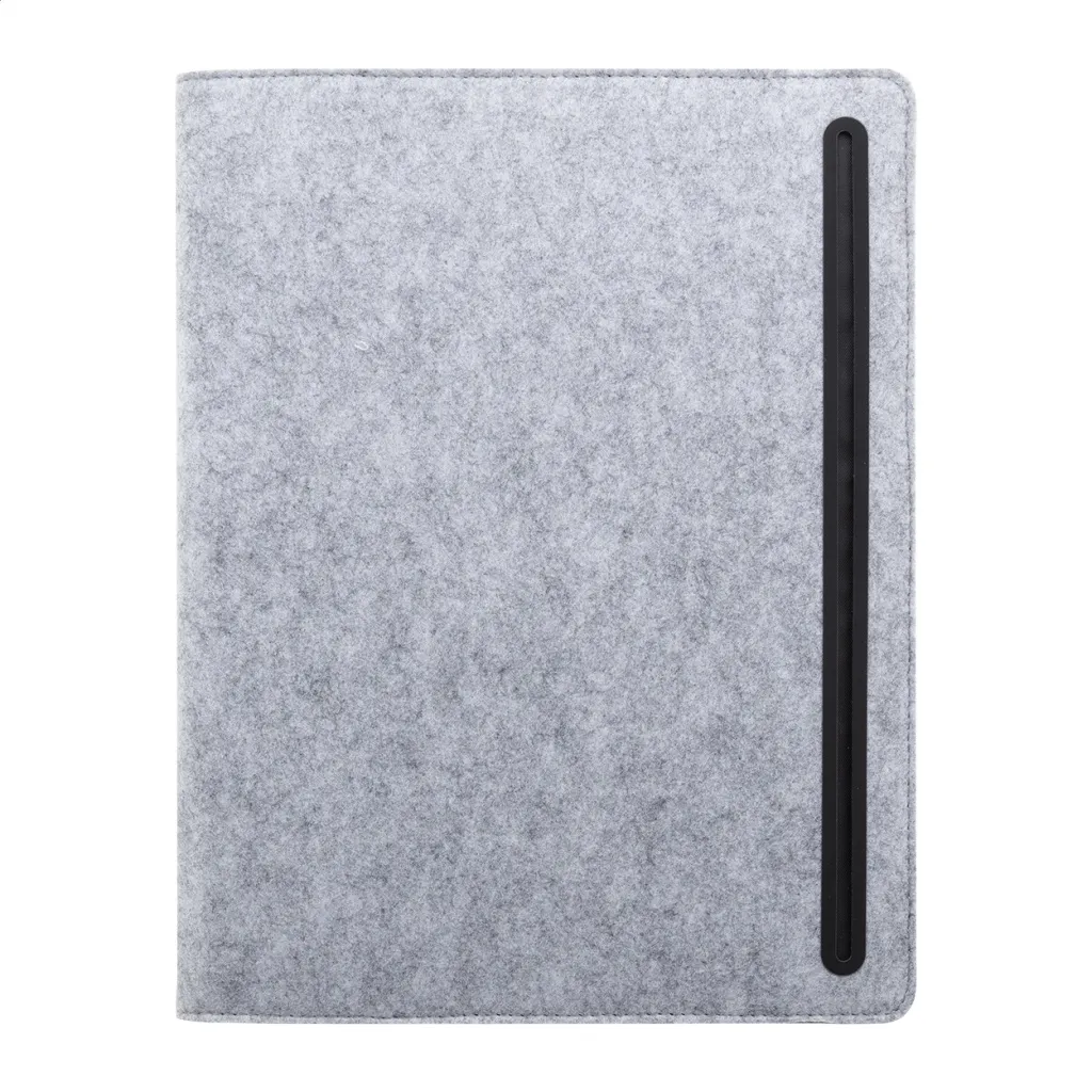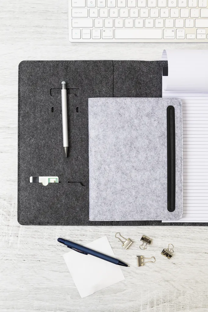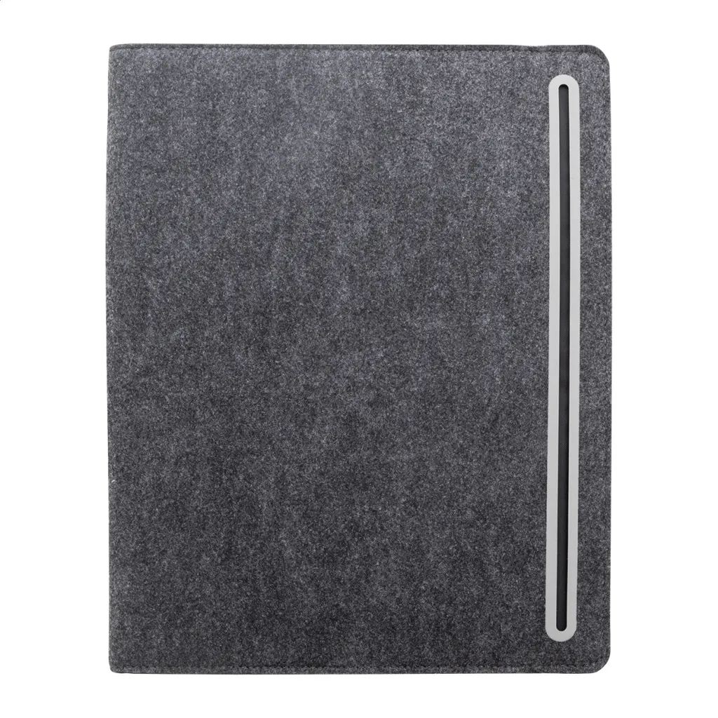 A4 sized, RPET felt document folder with front and multiple inside organizer pockets. With 20 lined sheets notepad in recycled paper.