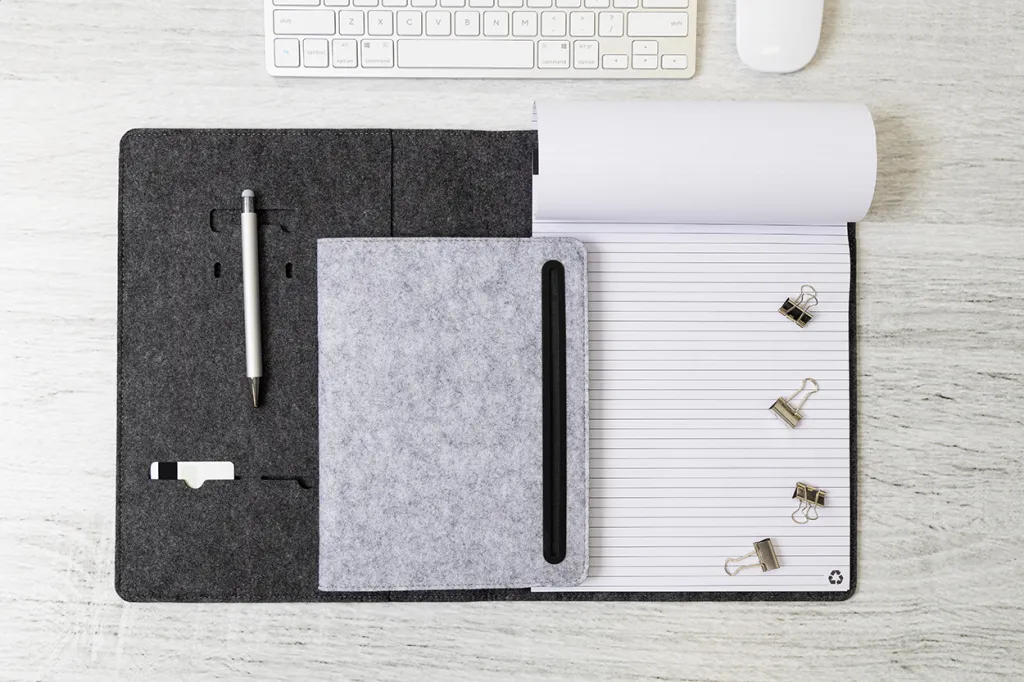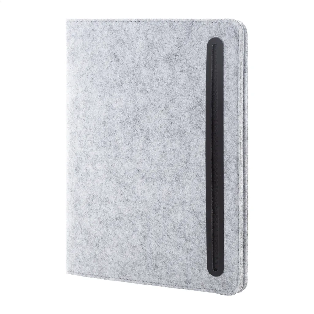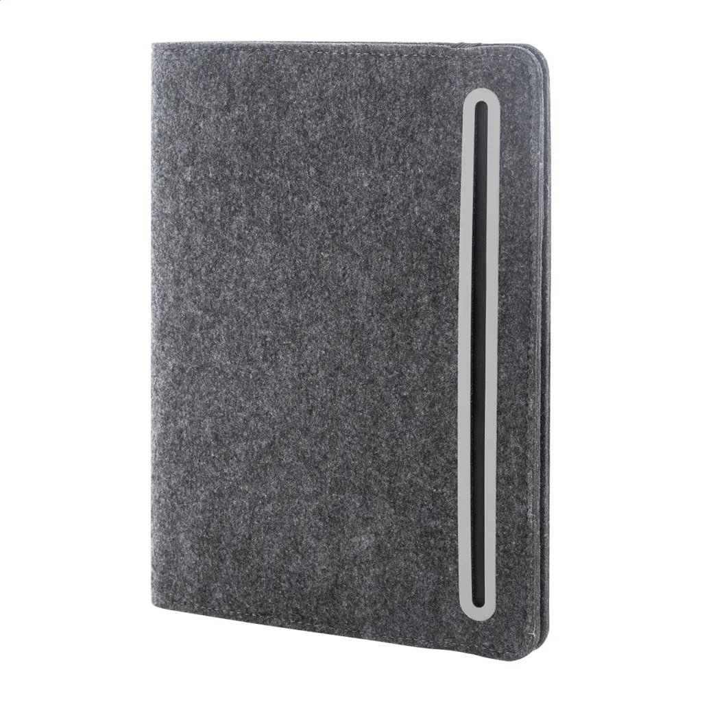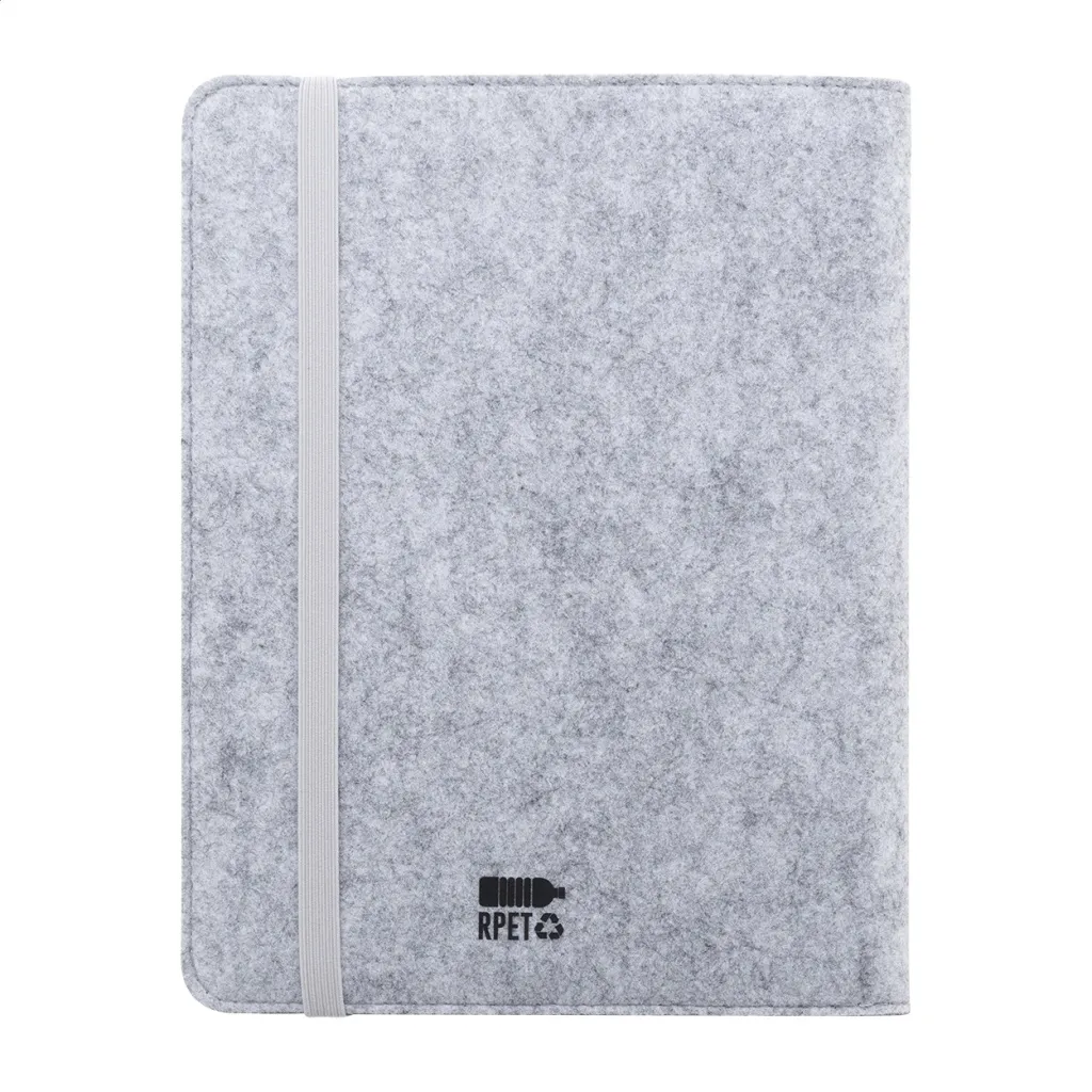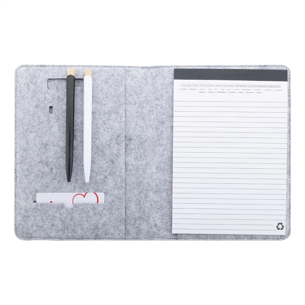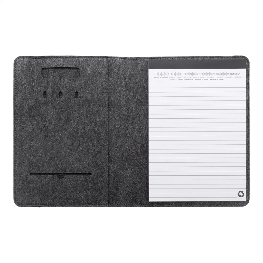 A5 sized, RPET felt document folder with front and multiple inside organizer pockets. With 20 lined sheets notepad in recycled paper.