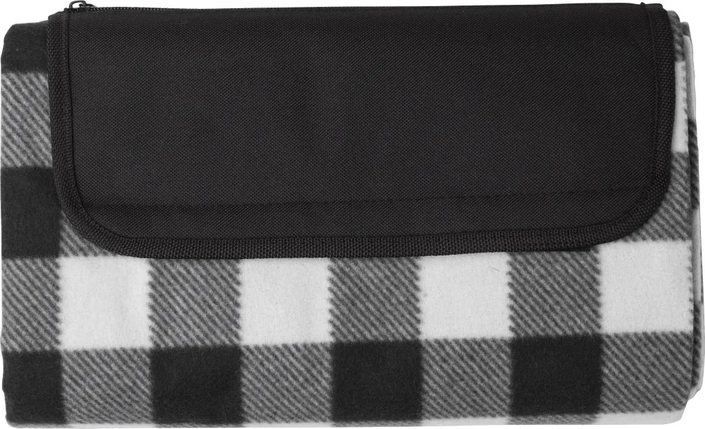 rPET foldable polar fleece blanket. 150gms. PEVA backing. Zippered front pocket. Short handle.