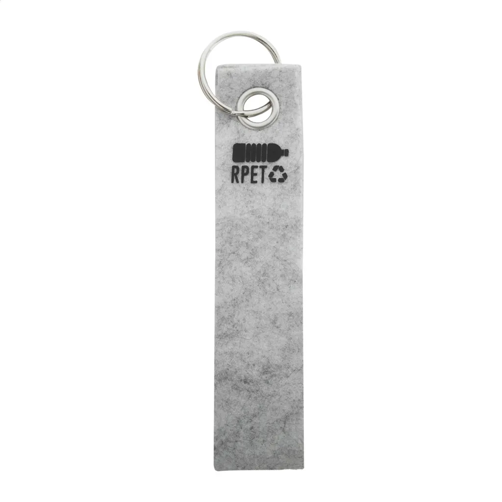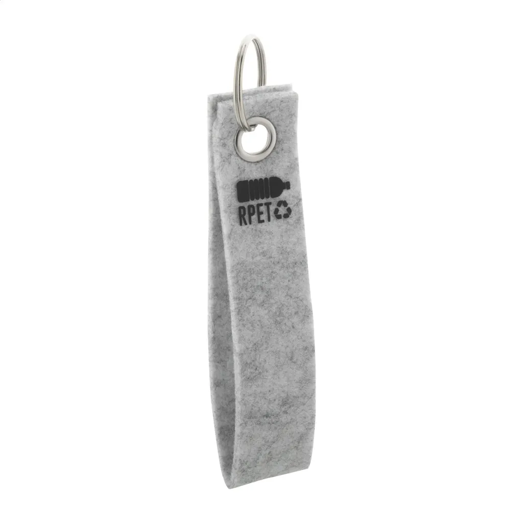 RPET felt keyring with metal ring. With distinctive RPET logo.