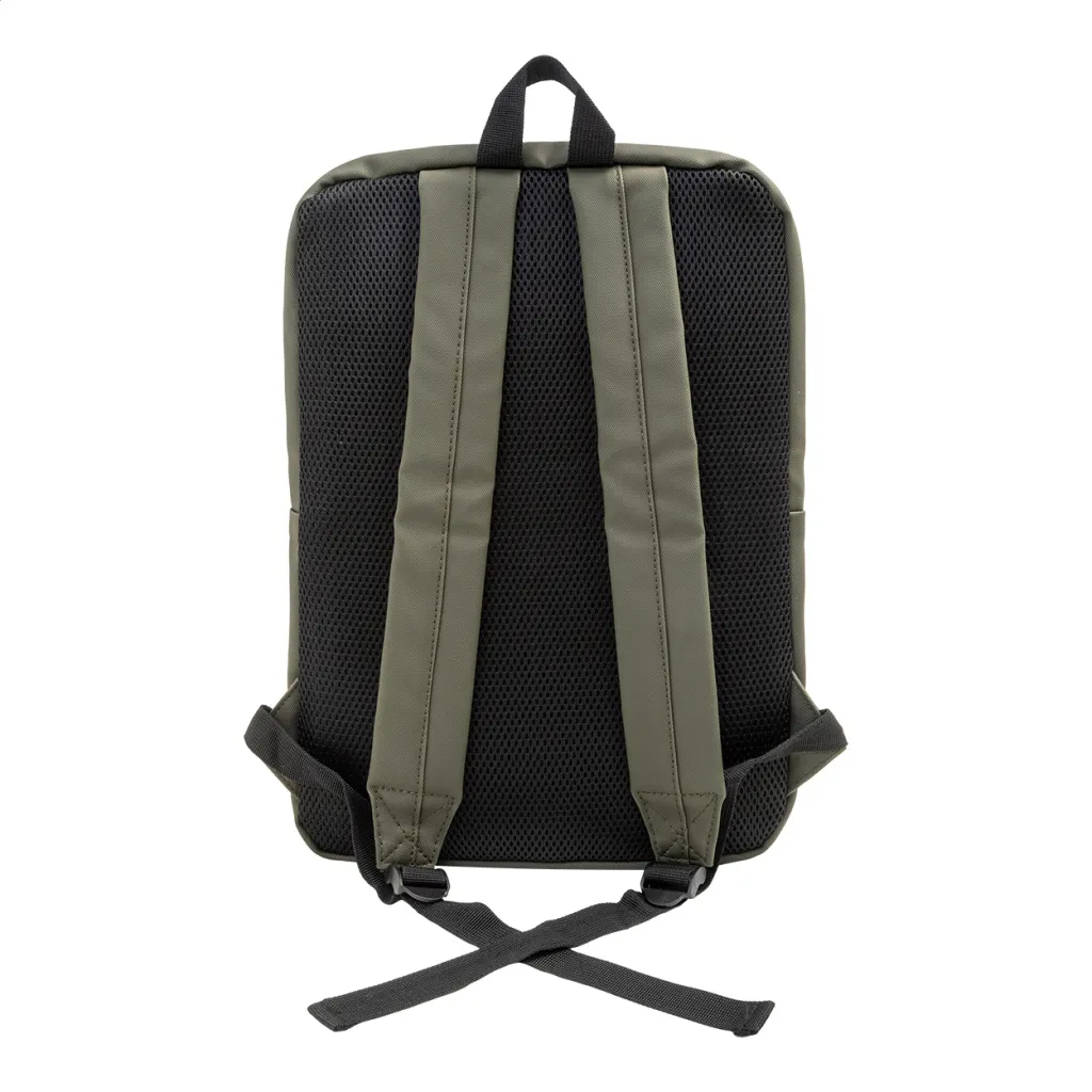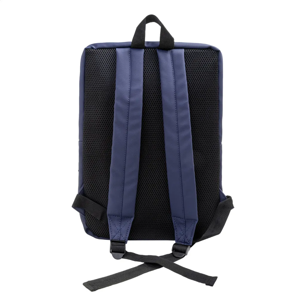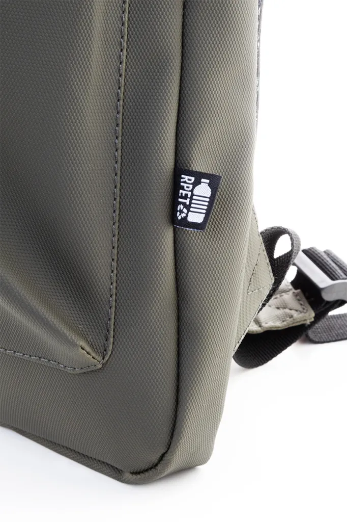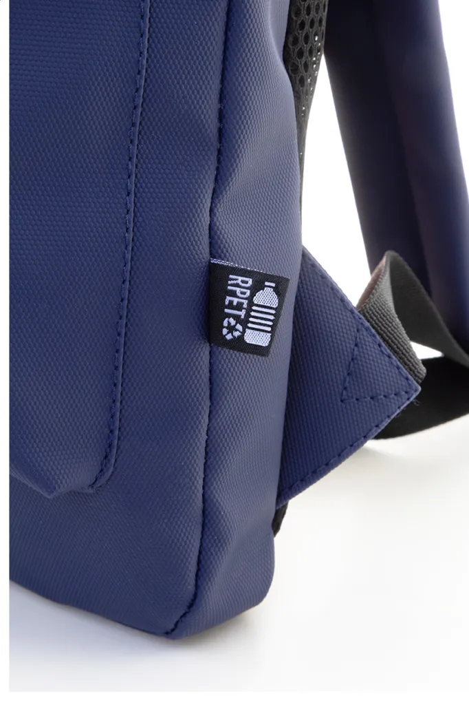Waterproof RPET slim laptop backpack with zipped laptop (15") compartment and zipped front pocket. With padded back and shoulder straps. PU coated 600D RPET polyester, with distinctive RPET label.