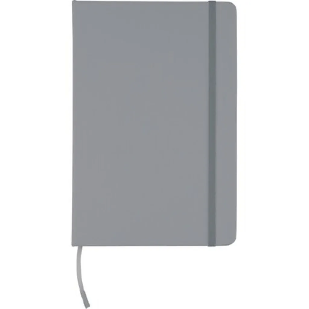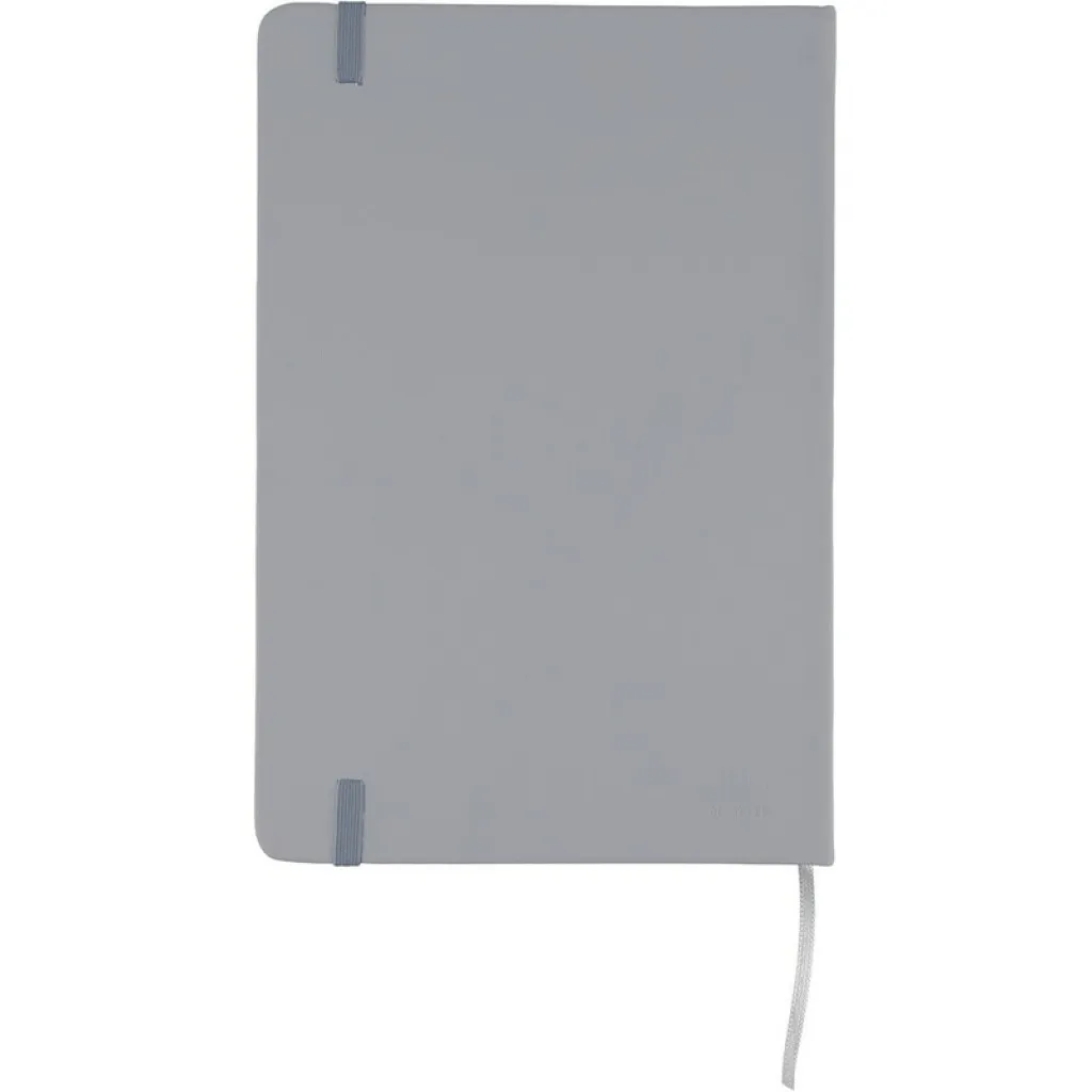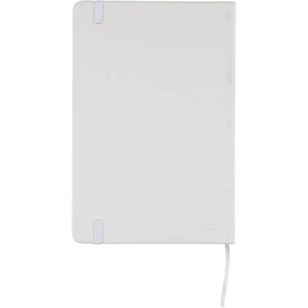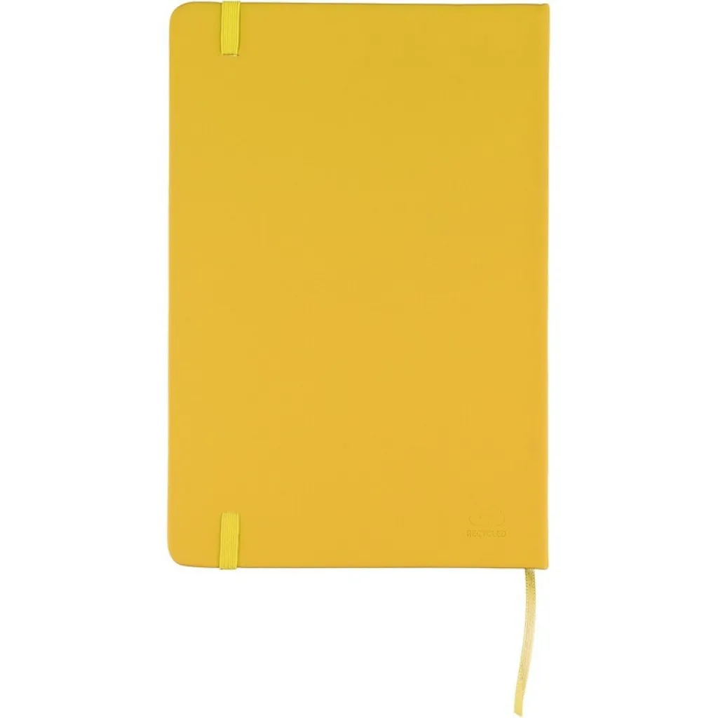 RPET notebook approx. A5 with a hard cover made of RPET PU, containing 80 lined pages (70 gsm), bookmark ribbon for easy marking of the last page or important notes, an extra coloured elastic band closure, includes recycled icon on the backside