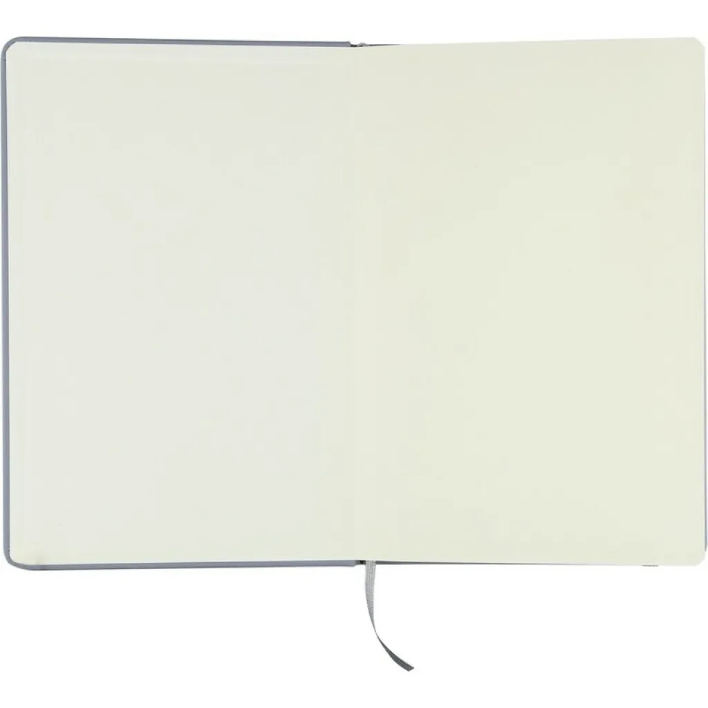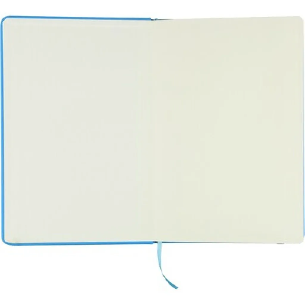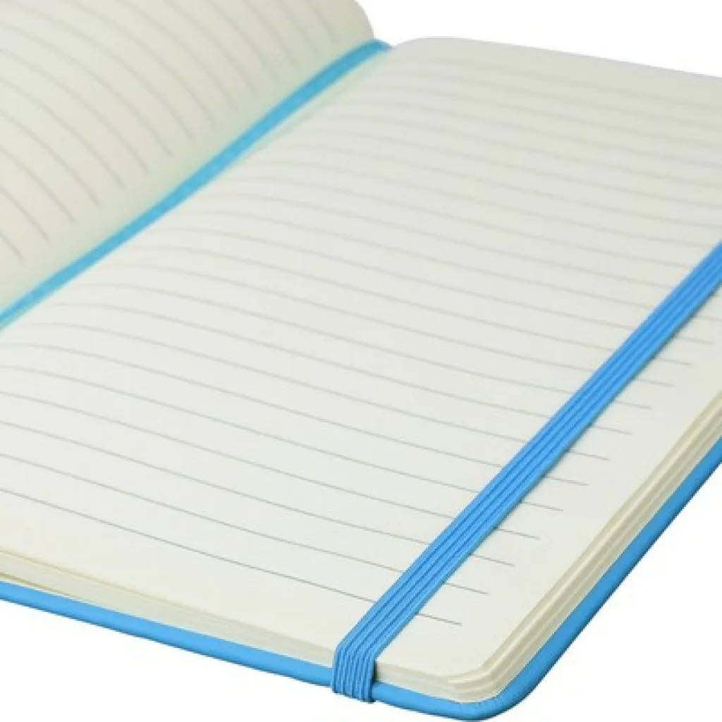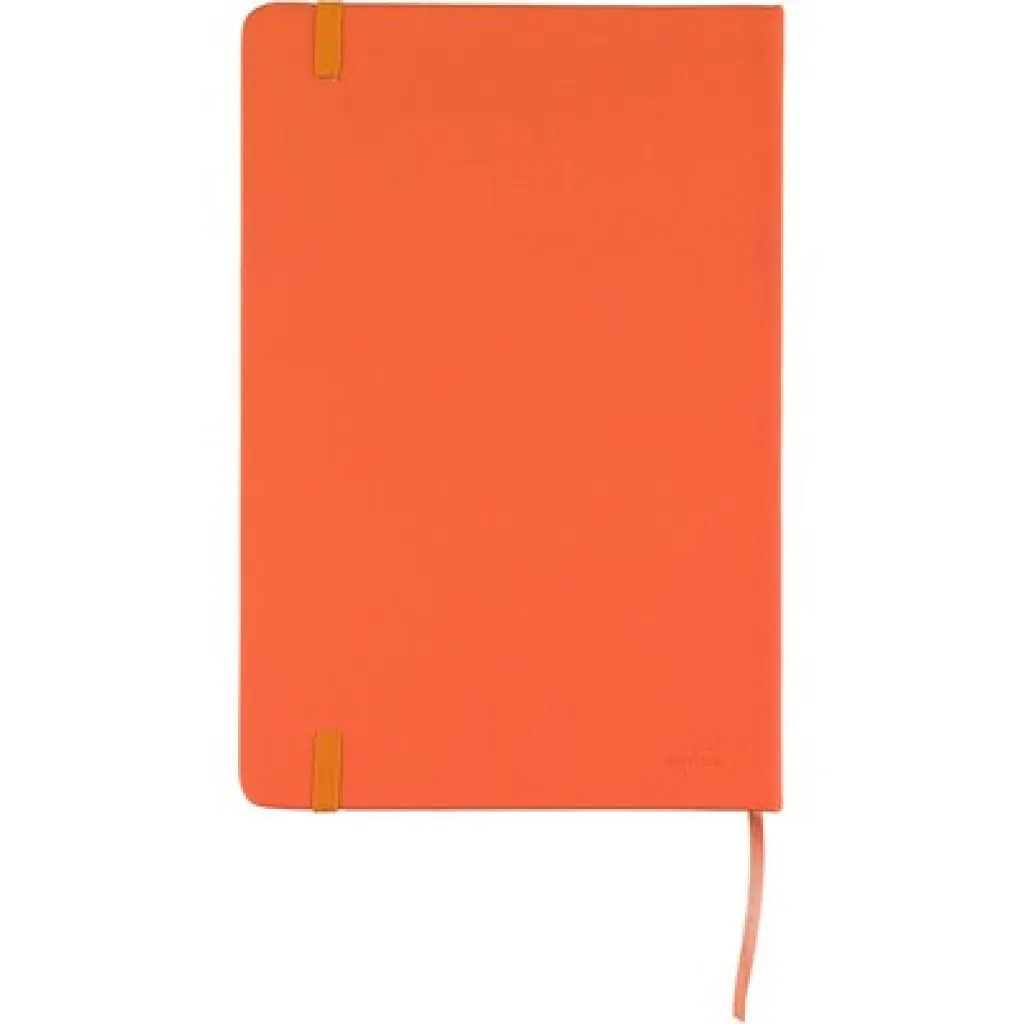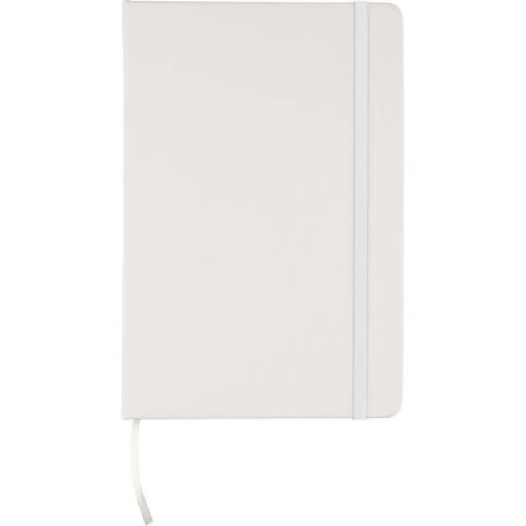 RPET notebook approx. A5 with a hard cover made of RPET PU, containing 80 lined pages (70 gsm), bookmark ribbon for easy marking of the last page or important notes, an extra coloured elastic band closure, includes recycled icon on the backside