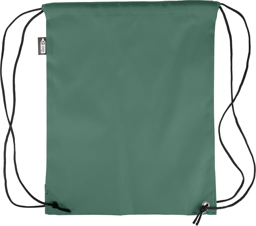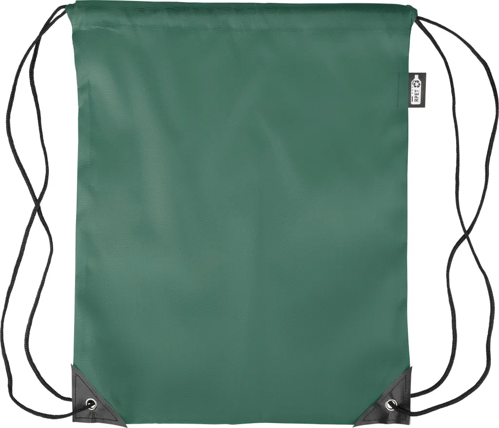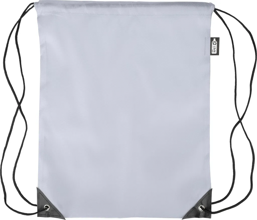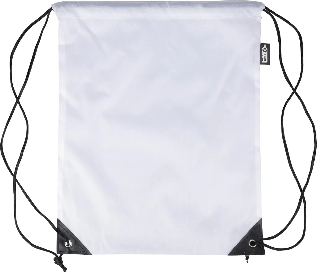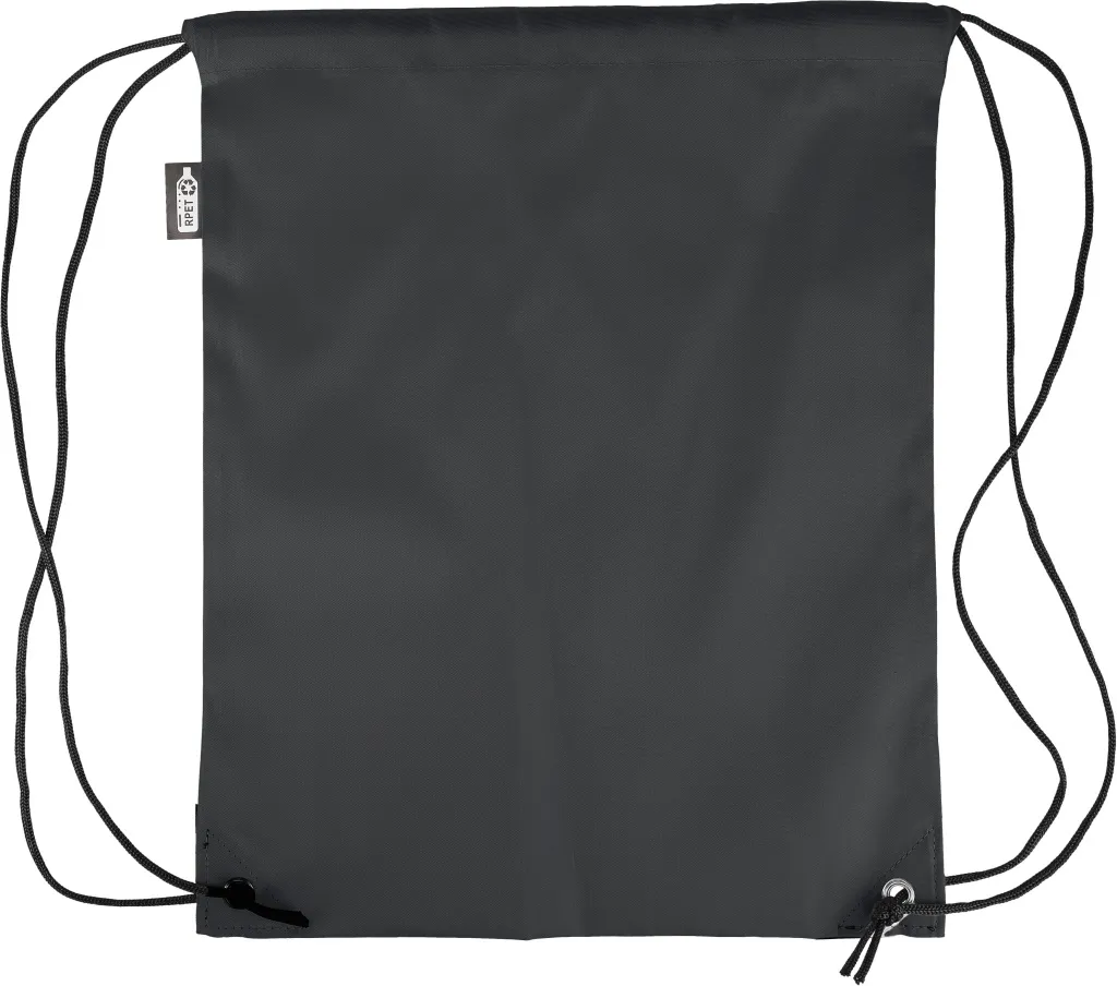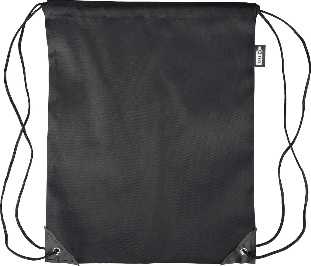 rPET polyester 210D drawstring backpack with two black PU corners on the front and internal sewing. Features a black nylon cord on each side, a pull-cord closure, and one inner compartment. Capacity: 5L. Carrying capacity: 7 kg. Includes an rPET label.