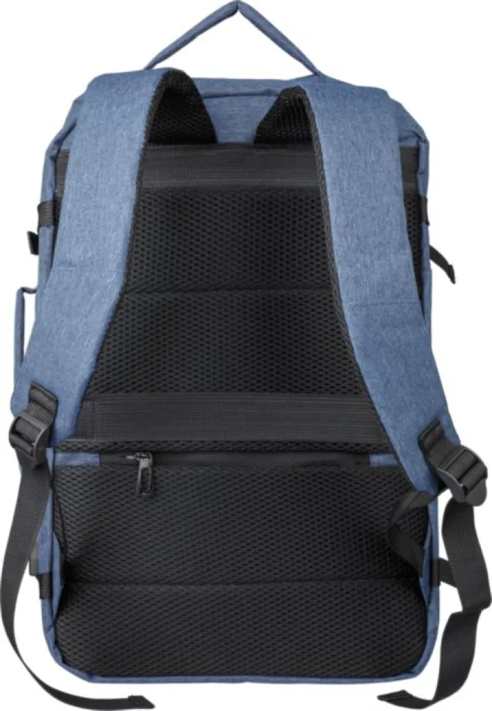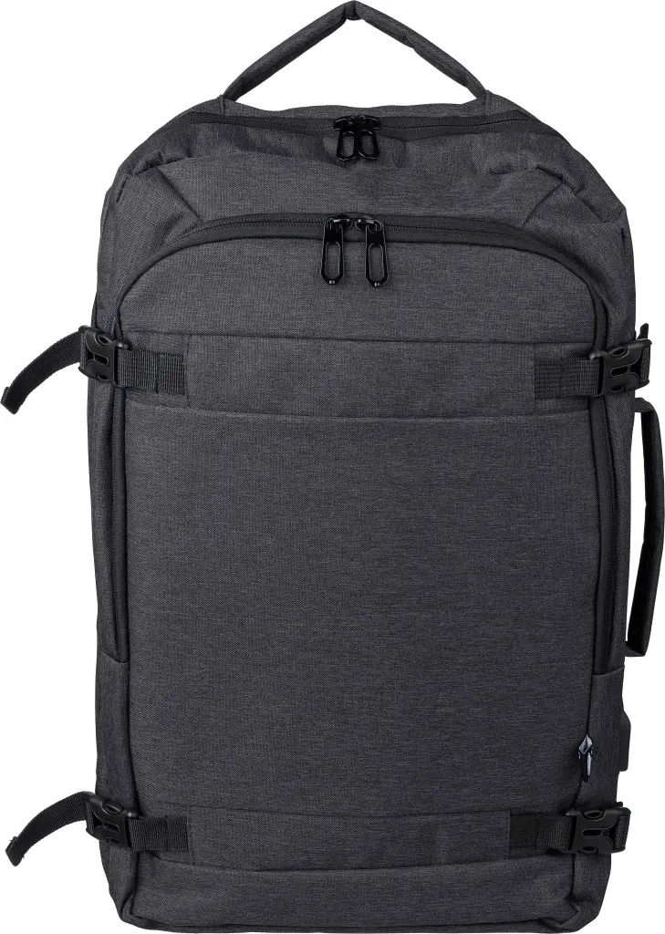 rPET polyester (300D) backpack and laptop bag (17 inch) with 210D lining inside. Cabin-proof. With carrying loop on top and sides. Velcro laptop compartment, anti-theft pocket, and two large zippered compartments. Ventilated padded backing, trolley strap, closing buckles, and USB-A port on the side. With side buckles to keep the luggage compact. Carrying weight approx. 12 kg. Includes rPET label.