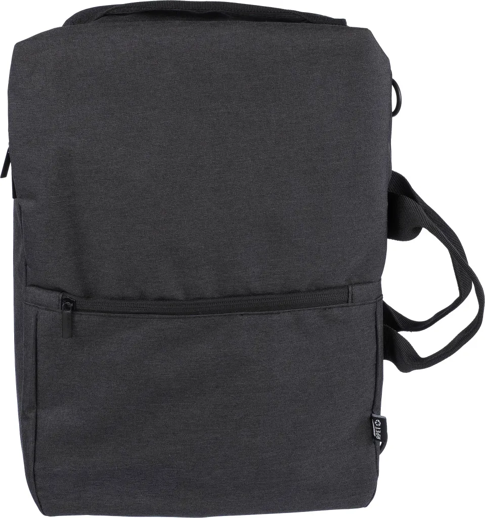 rPET polyester (300D) backpack and laptop bag (15 inch) with 210D lining inside. Cabin-proof. With carrying loop on top, adjustable shoulder straps, and two carrying handles on the side. Adjustable straps tuck behind the padding for a carry function with side handles. Velcro laptop compartment and small zippered compartment. With ventilated padded backing. Carrying weight approx. 8 kg. Includes rPET label.
