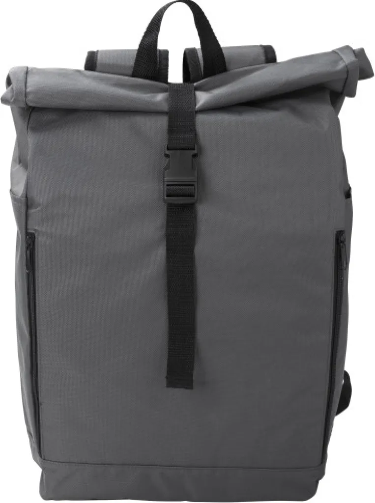 rPET polyester (600D) rolltop backpack. Two zipper pockets on the side. One large compartment. Velcro closing and buckle closing.