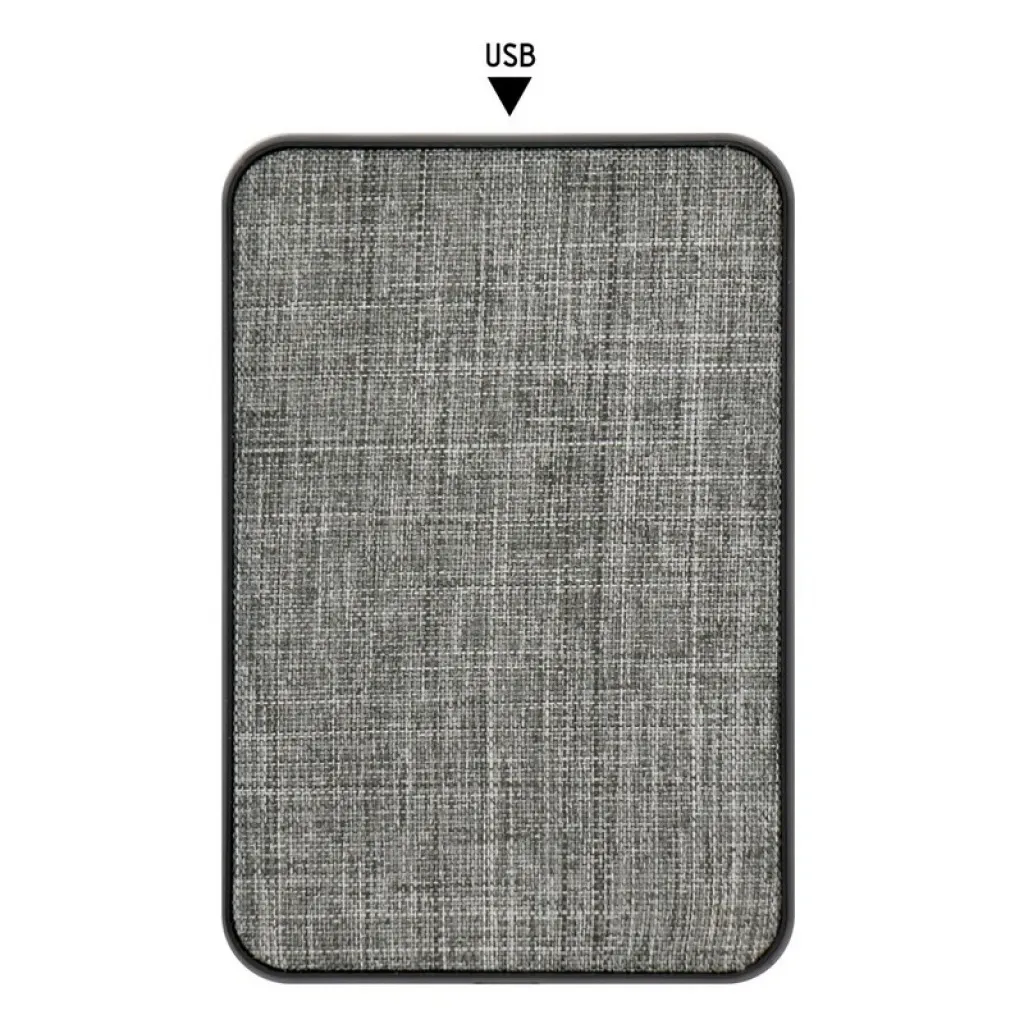 Power bank 5000 mAh with front part made of polyester RPET, 4 diodes indicating power level, 2 USB outputs (5V/2A), 2 inputs (5V/2A): micro USB and USB type C, micro USB cable included