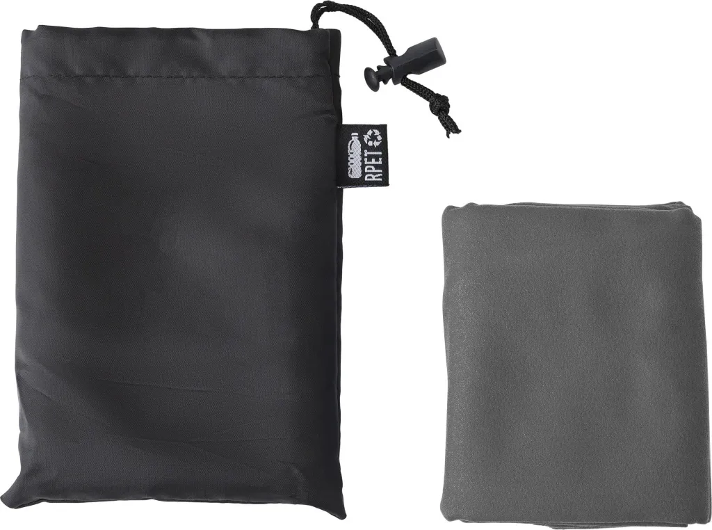 rPET towel (79cm x 30cm) in rPET pouch with drawstring closure.