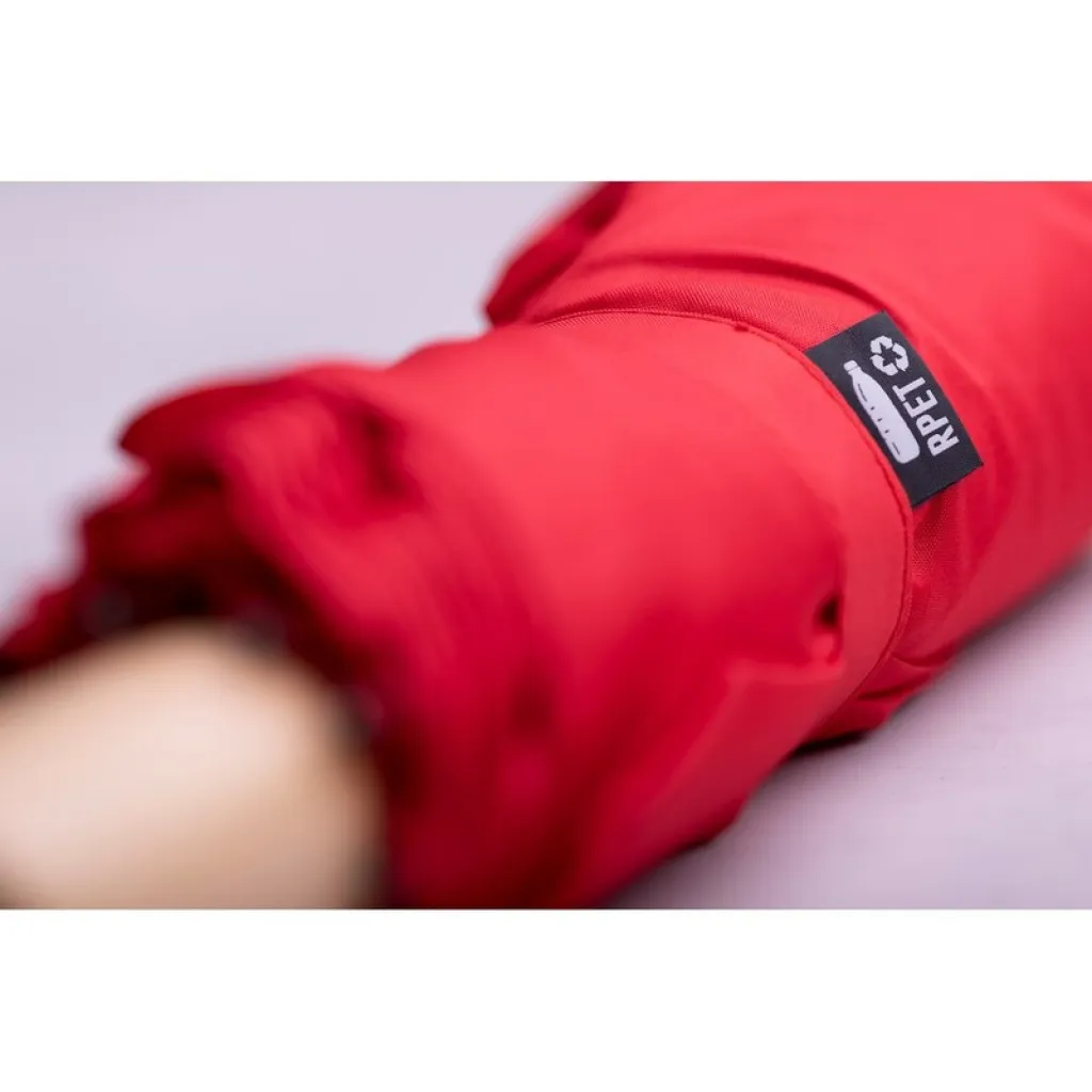 rPET windproof umbrella, manual, foldable, 8 panels, wood handle, metal ribs, velcro closing, pouch included