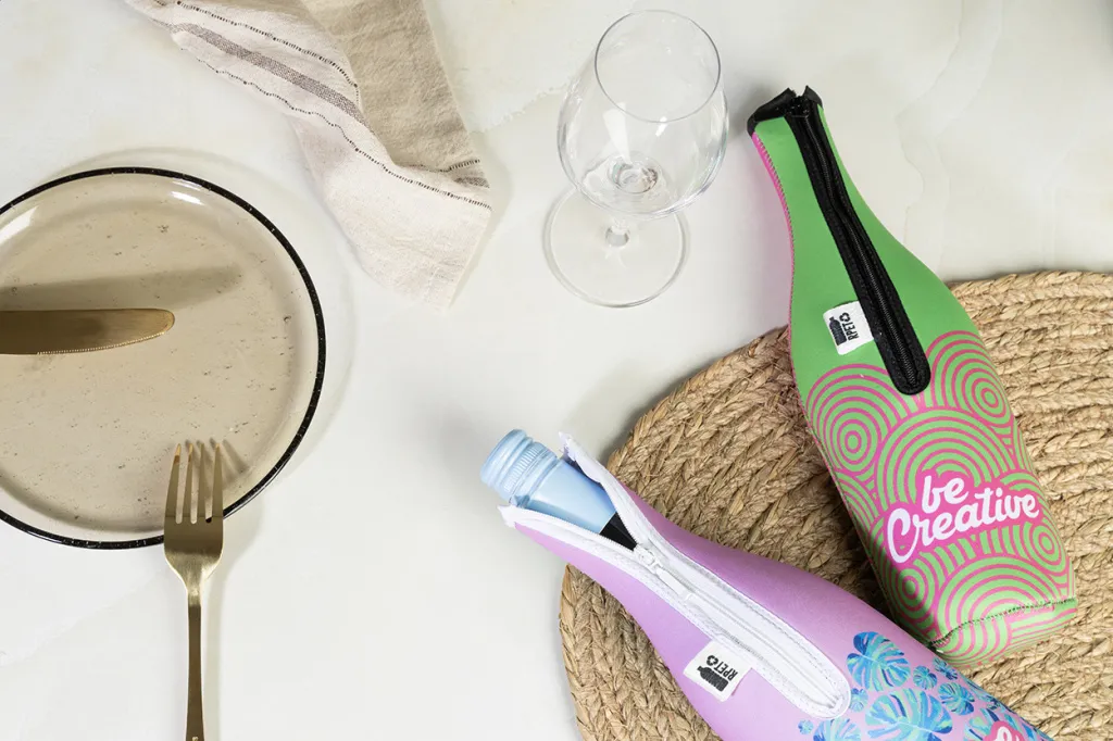 Custom made, zipped RPET neoprene cooler cover for wine or champagne bottle. With all over sublimation printed graphics. MOQ: 25 pcs.