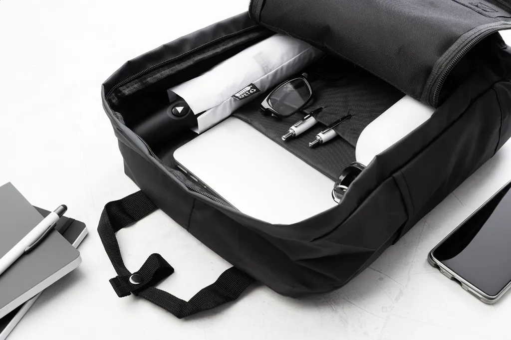 Waterproof, soft recycled PU leather backpack with zipped main compartment, 2 zipped front pockets, side pockets and padded laptop (15") and tablet (10") compartment. With padded back and shoulder straps. With distinctive recycled PU label.
