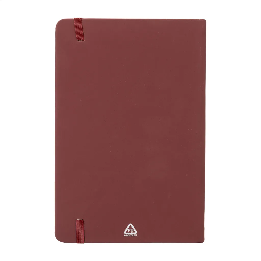 Recycled PU leather covered notebook with 100 lined sheets in recycled paper. With matching colour bookmark and rubber band. A5 size.