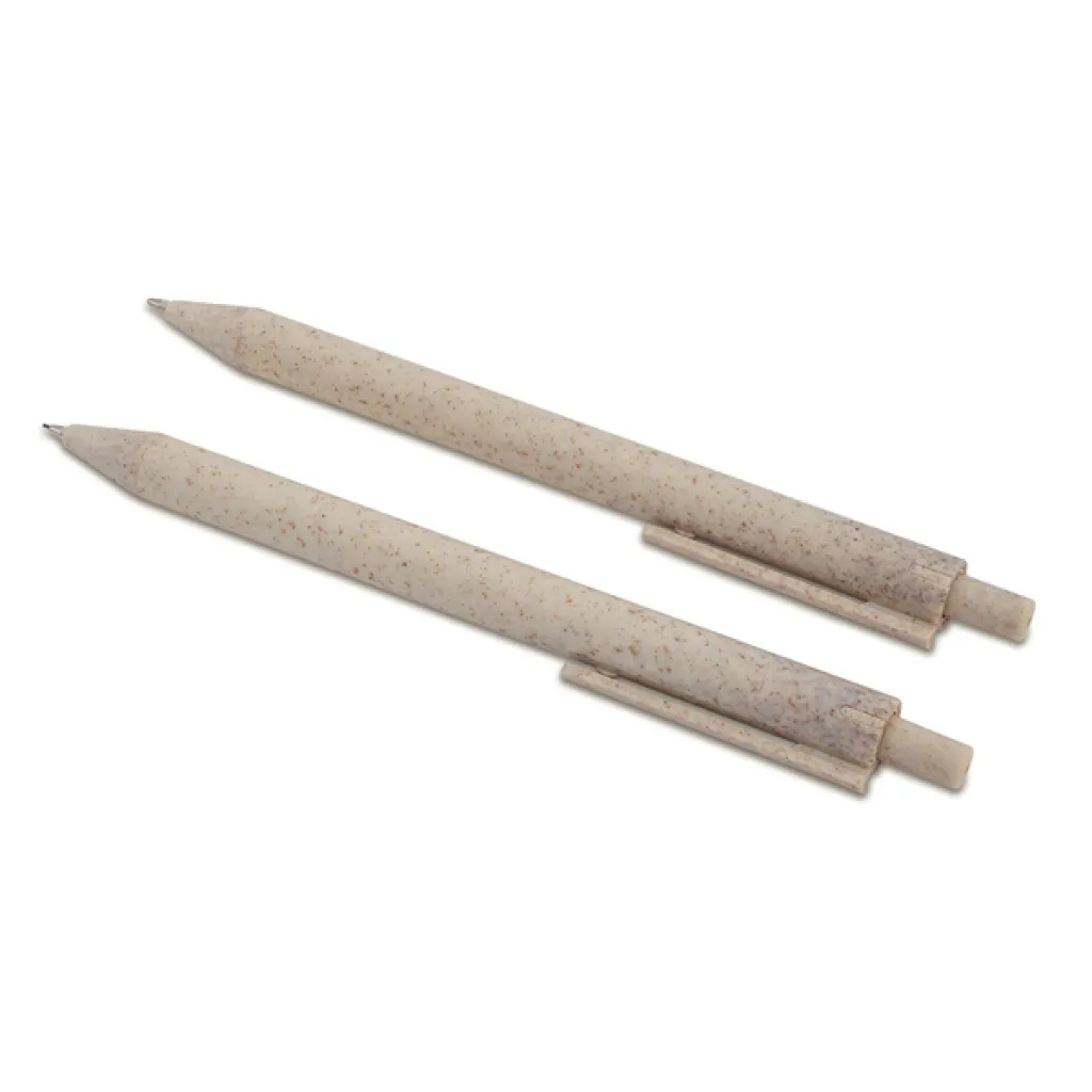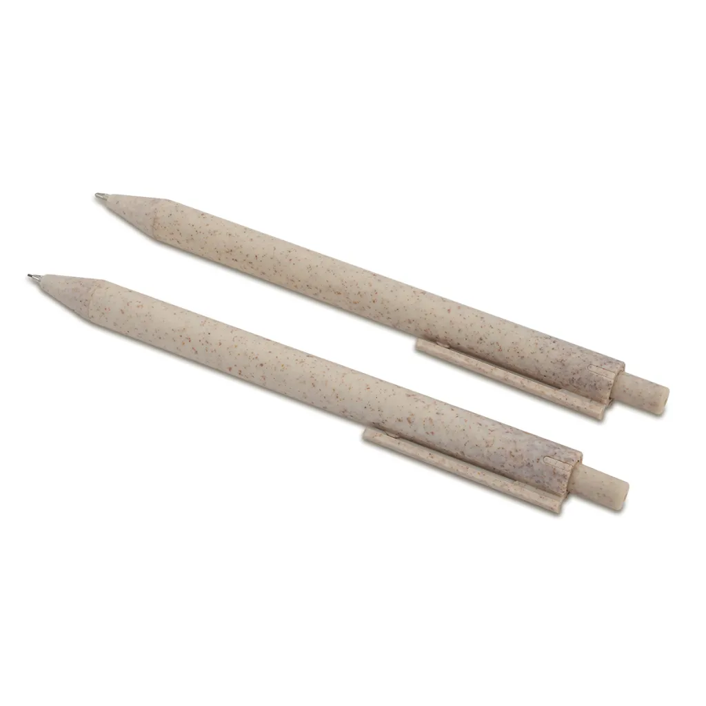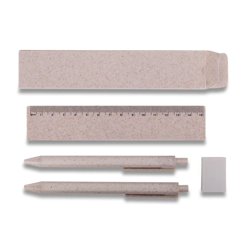 Wheat straw material stationery set including ballpen, automatic pencil, ruler, eraser. All pack in a box. Blue refill.