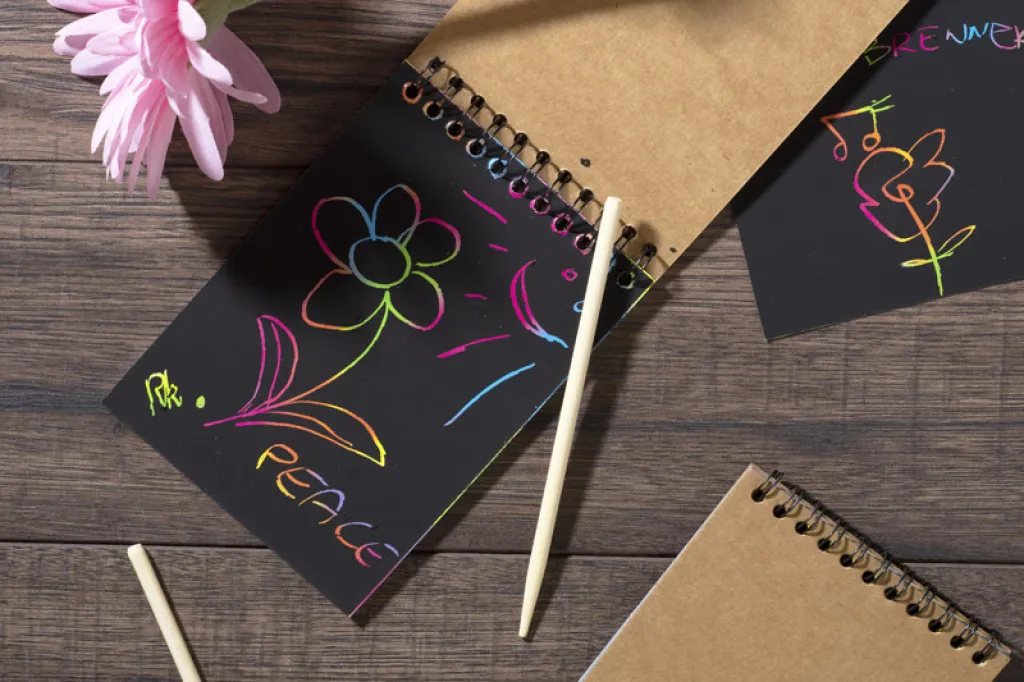 Unusual notebook with black scratch-off sheets. You can make a colorful rainbow picture with a bamboo stick. This is a great way to develop your own imagination by creating your own scratch card compositions.